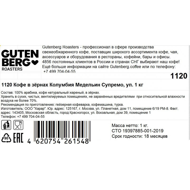 На сегодняшний день товар «Кофе в зёрнах Gutenberg Колумбия медельин супремо 250г» можно купить с кешбеком в 1 магазине: Яндекс.Маркет