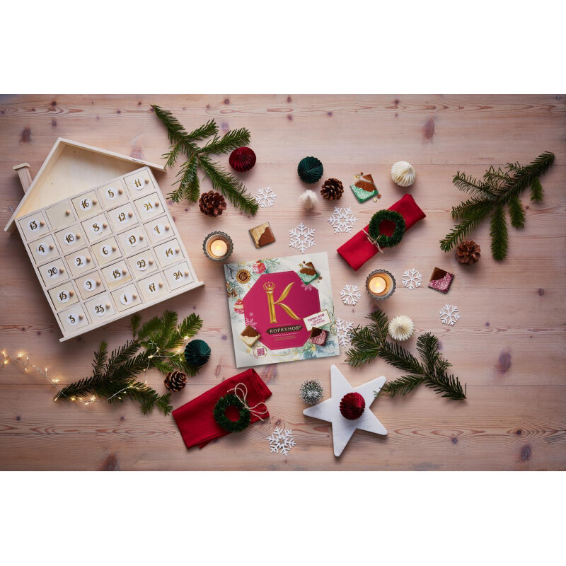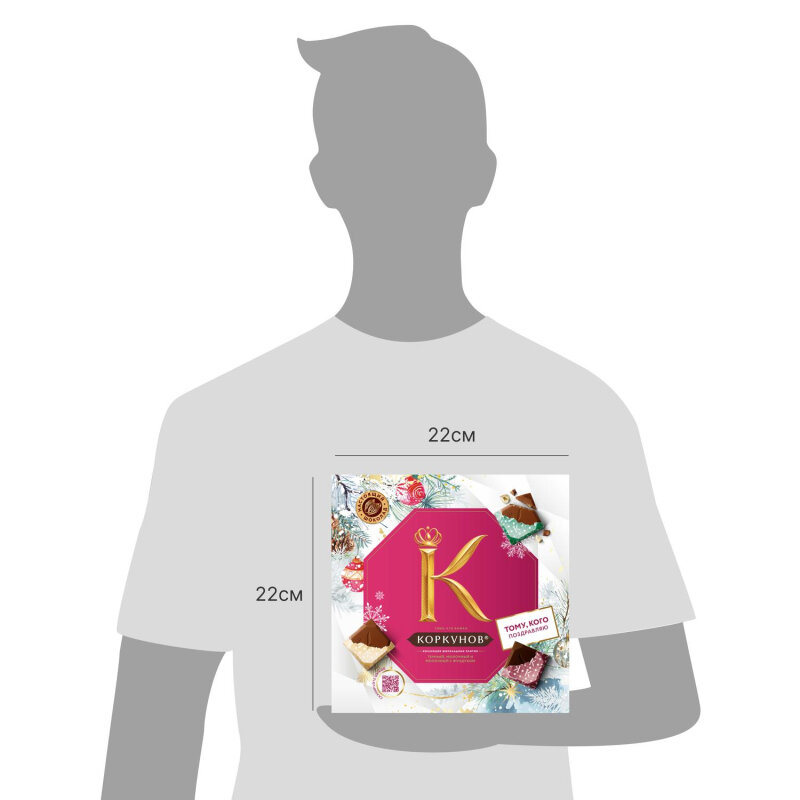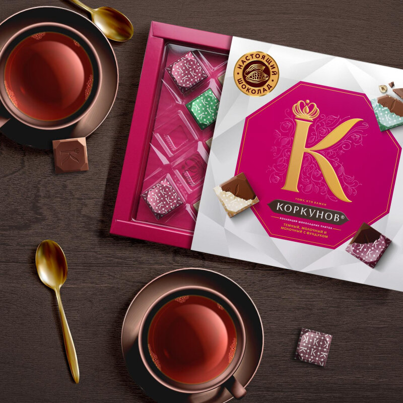 | Комплектация | Темный шоколад Коркунов. Количество - 7 штук. Молочный шоколад Коркунов. Количество - 5 штук. Молочный шоколад Коркунов с дробленым фундуком. Количество – 3 штуки. |