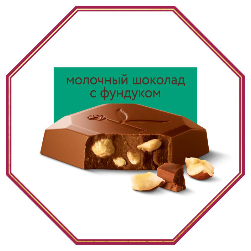 | Состав | Молочный шоколад (сахар, сухое цельное молоко, какао масло, какао тертое, молочный жир, эмульгаторы (соевый лецитин, сорбитан тристеарат), ароматизатор (ванилин)); темный шоколад (какао тертое, сахар, какао масло, молочный жир, эмульгаторы (соевый лецитин, сорбитан тристеарат), ароматизатор (ванилин)); дробленый фундук. |