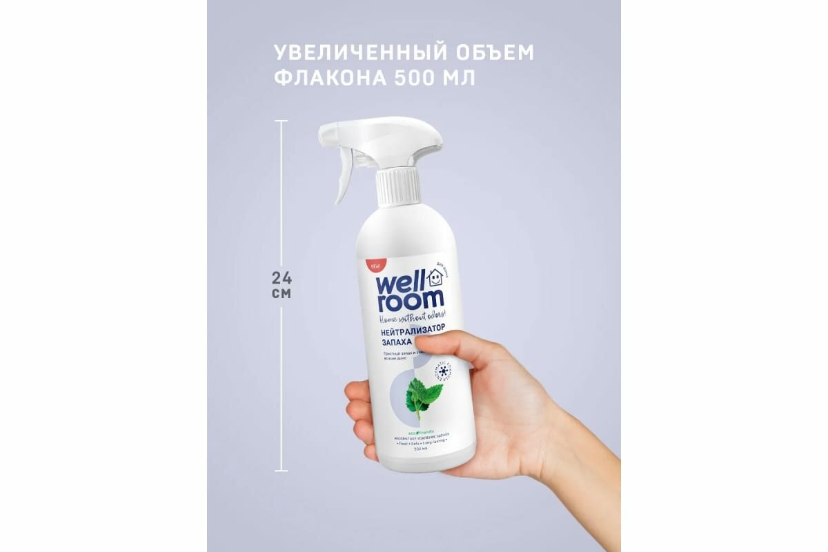 Универсальный нейтрализатор Wellroom длительной чистоты и мятной свежести в вашем доме. Комплекс активных веществ работает на молекулярном уровне, не маскируя запахи, а связывая их молекулы. Не оставляет пятен и разводов. Безопасен для людей, животных и окружающей среды. Когда пригодится? Если вам нужно блокировать запахи подгоревшей еды на кухне или едкие - из мусорного ведра. Также подойдет для обработки пустого холодильника - избавит от запахов залежавшихся или особенно пахучих продуктов. Поможет при регулярной уборке - нейтрализует въевшиеся запахи на шторах и диванных подушках. Кроме этого средство Wellroom справляется с затхлостью в кладовках и может использоваться для уборки в шкафах с обувью. Устраняет неприятные запахи на одежде: сигаретного дыма, еды, краски и т. д. Отлично выполняет роль освежителя воздуха во всем доме.