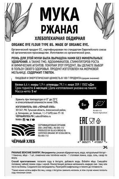Органическая (EU 834/2007) неотбеленная ржаная мука среднего помола. Это мука с выходом 65% от веса зерна. Обладает приятной серо-белой окраской с мелкими вкраплениями частиц оболочек зерна. Чаще всего используется для выпечки традиционного и заварного хлеба, а также печенья, пряников и кексов. При хлебопечении ржаная обдирная мука обеспечивает пористость, эластичность мякиша и хорошую форму булки. Покупая этот продукт, вы делаете выбор в пользу своего здоровья.