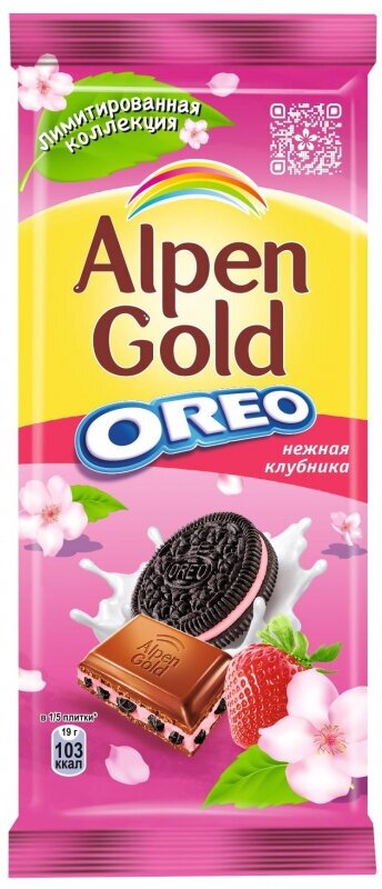 Шоколад Alpen Gold Молочный с клубникой и печеньем Oreo 90г Мондэлис Русь