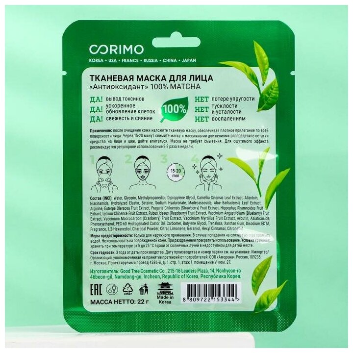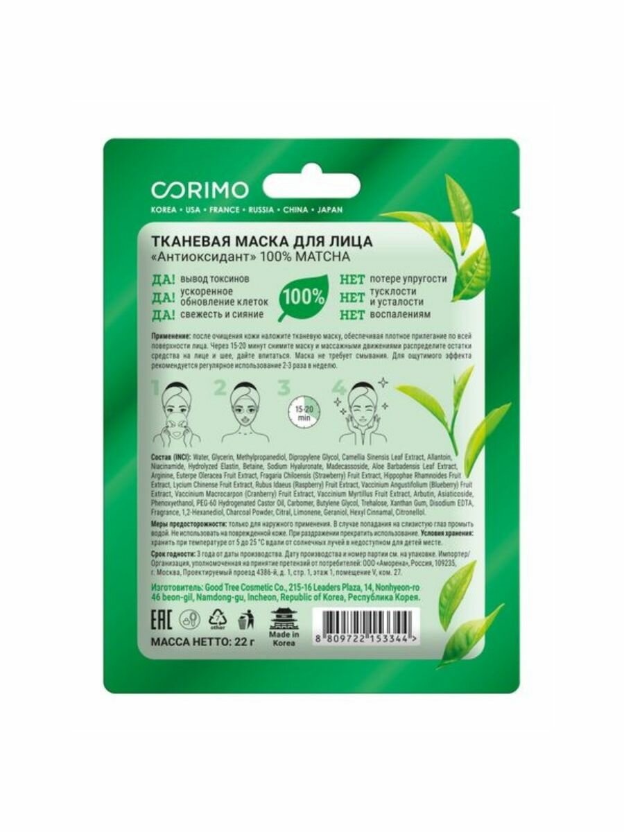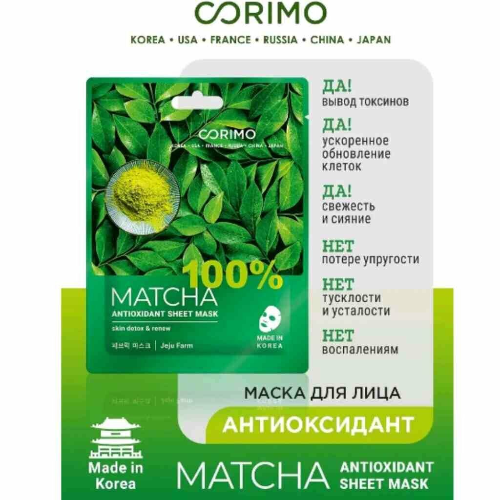 Маска для лица Corimo Matcha 100% Антиоксидант 22г Good Tree Cosmetic Co