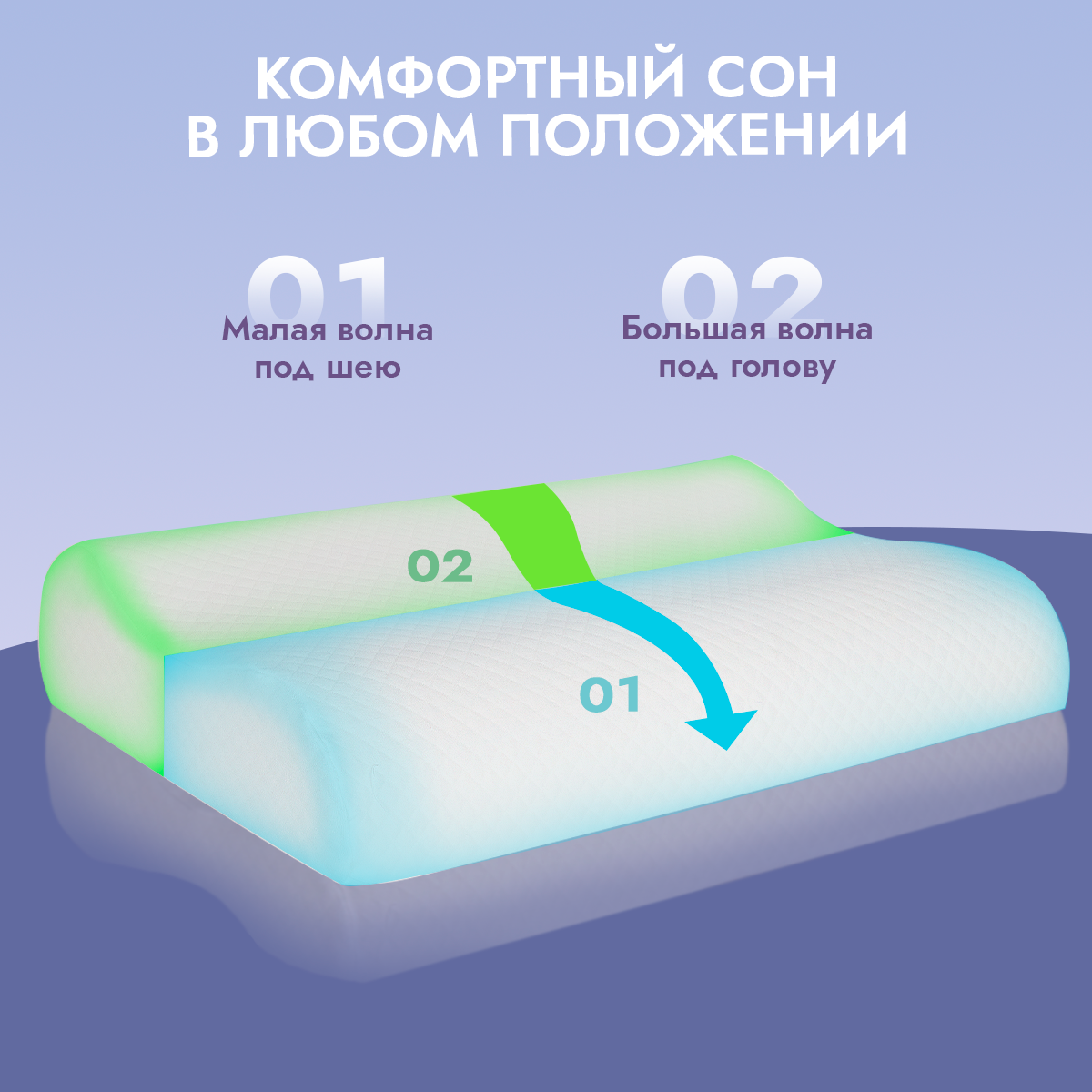 Подушка для сна в форме волны повторяет анатомический изгиб шеи, гарантируя правильное положение головы. Два эргономичных валика имеют разную высоту для сна на боку или на спине. Универсальная конструкция обеспечивает здоровый сон вне зависимости от предпочтений. Поддержка шейного отдела валиком оказывает ортопедический эффект, помогает расслабиться после дневной нагрузки и создает наилучшие условия для качественного отдыха. Анатомическая подушка способствует расслаблению мышц шеи и является профилактикой головных болей напряженного типа. Расслабление нормализует кровоток, что в свою очередь влияет на зрение, состояние волос и ваше самочувствие по утрам. Кроме того, зажимы мышц – один из основных факторов старения. Например, мышцы шеи отвечают за овал лица. Подушка для сна замедляет старение по мускульному типу.