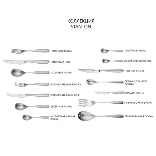 | Состав набора | 6 столовых ложек; 6 чайных ложек; 6 кофейных ложек; 6 столовых вилок; 6 десертных вилок; 6 столовых ножей; 6 десертных ножей |