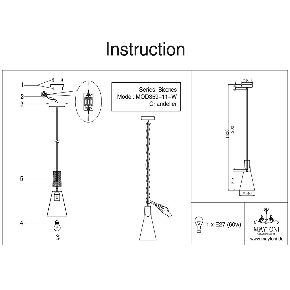 Подвесной светильник Bicones P359-PL-140-W - продукт известной компании Maytoni (Германия). Имеет максимальную мощность 60 Вт, освещает площадь до 3 кв. м. Отлично подойдет для таких мест, как гостиная, кафе, кабинет, кухня, над обеденным столом, над кухонным островом. Впишется в интерьеры следующих стилей: модерн.