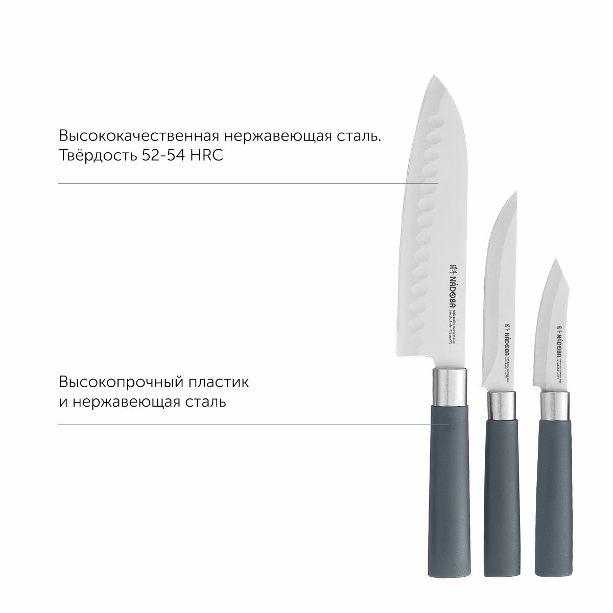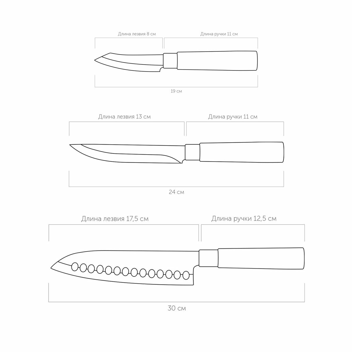 | Комплектация | нож для овощей 8 см, нож универсальный 13 см, нож поварской 17,5 см |