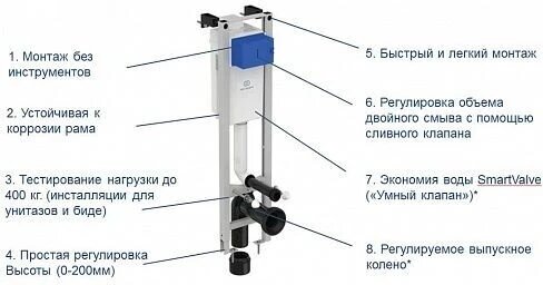Унитаз с инсталляцией Ideal Standard Connect W220101 3 в 1. Промо-комплект, состоящий из: E803501; E712701; E233267. Подвесной унитаз, крышка-сиденье микролифт, встраиваемая инсталляция для монтажа унитаза. Для монтажа перед капитальной стеной или между двумя гипсокартонными стенами (в соответствии с инструкцией). Ширина рамы всего 30 см - подходит для узких стен. Рама тестирована нагрузкой 400 кг; устойчива к коррозии и царапинам. Легкая и быстрая установка при помощи системы EasyFix system. Сливной патрубок. Регулируемая высота от 0 до 200 мм, регулировка высоты ножек. Встраиваемый бачок с фронтальным механическим управлением. Двойной смыв, пред-установка 6/3 л (регулировка до 4/2,5 л). Полипропиленовый бачок, устойчивый к термальным перепадам; прокладка против конденсата в комплекте. Маркировка наливного клапана CE EN 14055 CL1; тихий клапан, соответствующий стандарту NF, категория Class I, толщина бачка 187 мм; 1 точка подключения воды (вверху по центру). Аксессуары в комплекте: крепеж для унитаза; крепежи для рамы; подсоединения входящей и сливной труб; сливная труба и адаптор Ø90/110; резиновая прокладка для унитаза Ø45 мм; защитная коробка; запорный клапан G ½