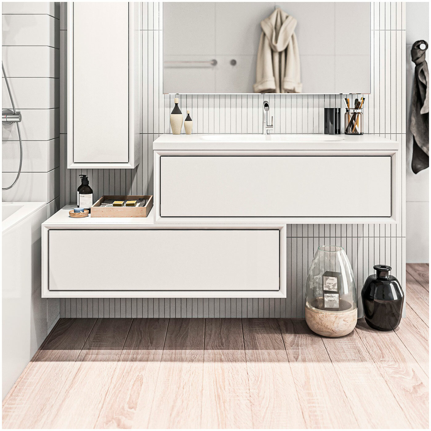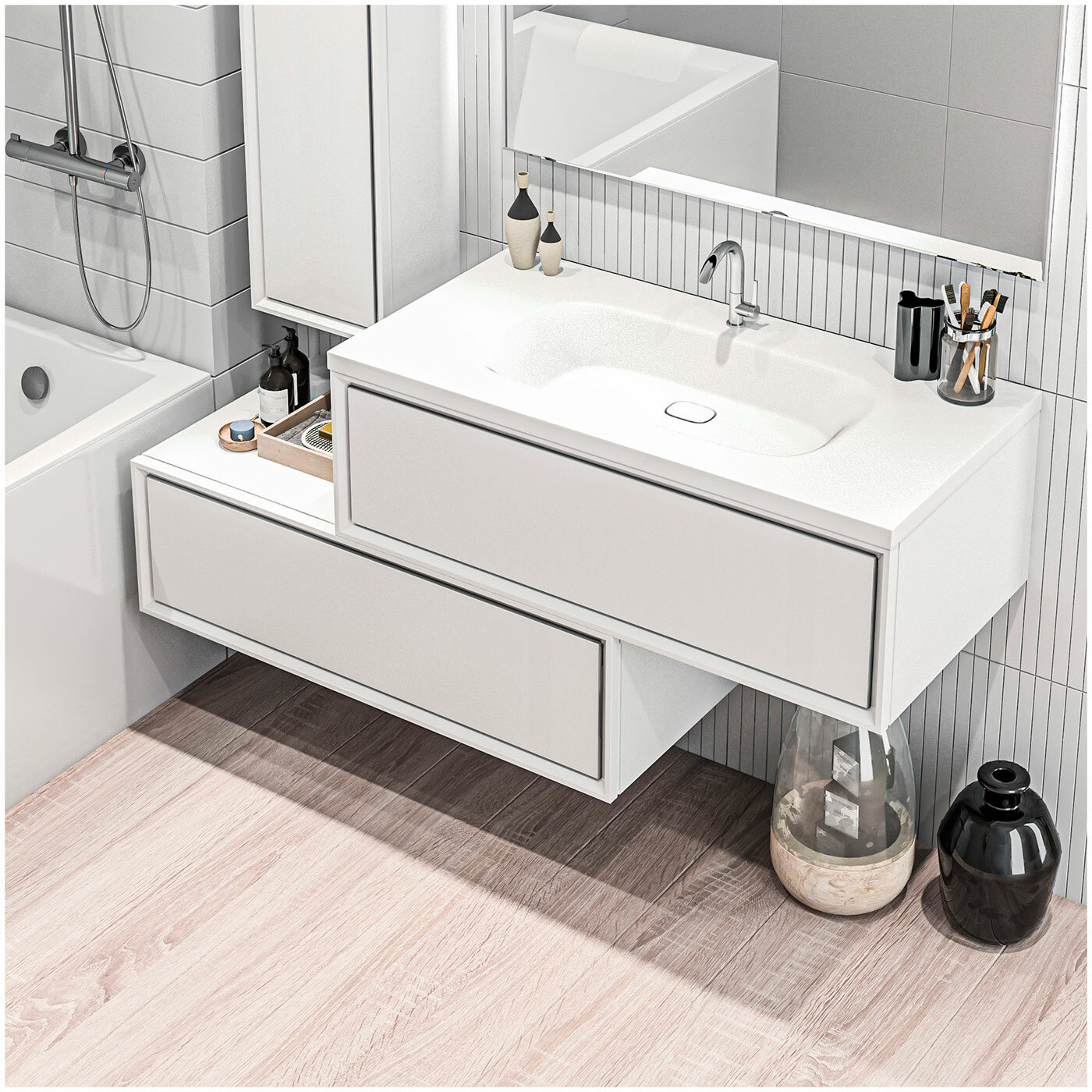 Компактная мебель выполнена в современном минималистичном стиле, для которого характерны правильные геометрические формы, рациональность и эргономичность. Для бережливой повседневной эксплуатации, тумбы оснащены демпферами и дверными петлями с доводчиками, обеспечивающими бесшумное и мягкое закрывание.