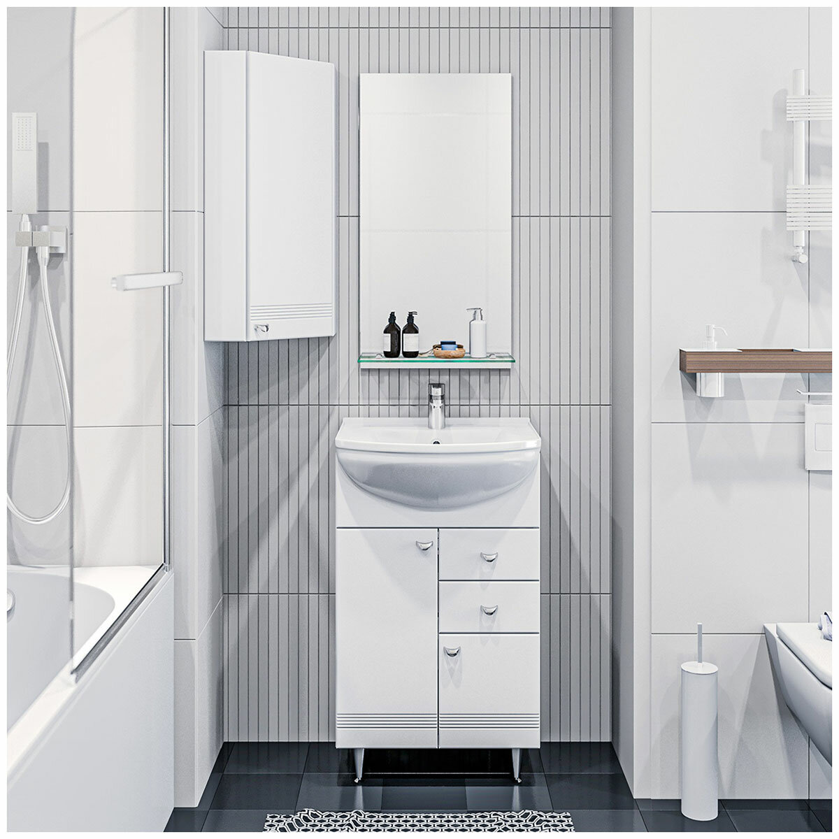 - Система хранения: 1 распашная дверца с механизмом плавного закрывания, полки.