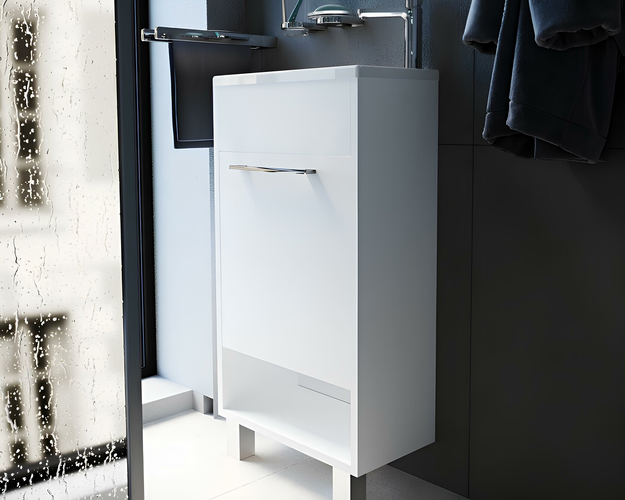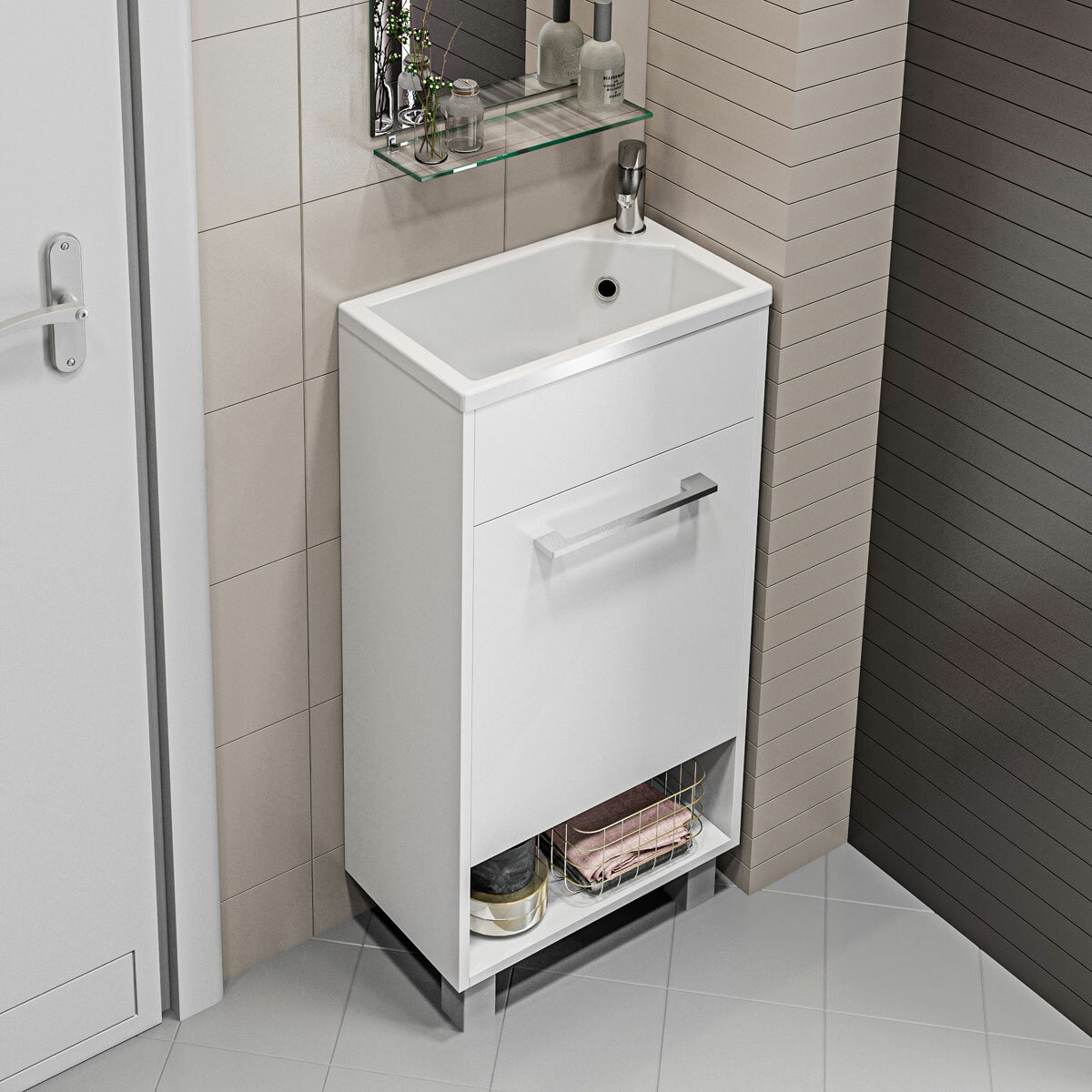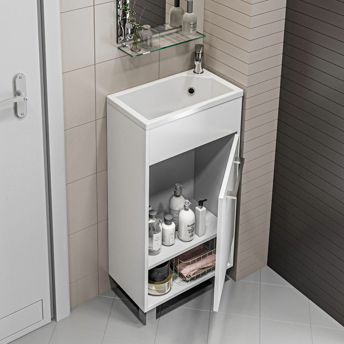 - Система хранения: 1 распашная дверца с механизмом плавного закрывания, полка внутри шкафа, открытая полочки снизу.