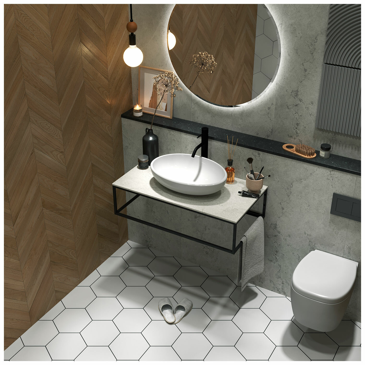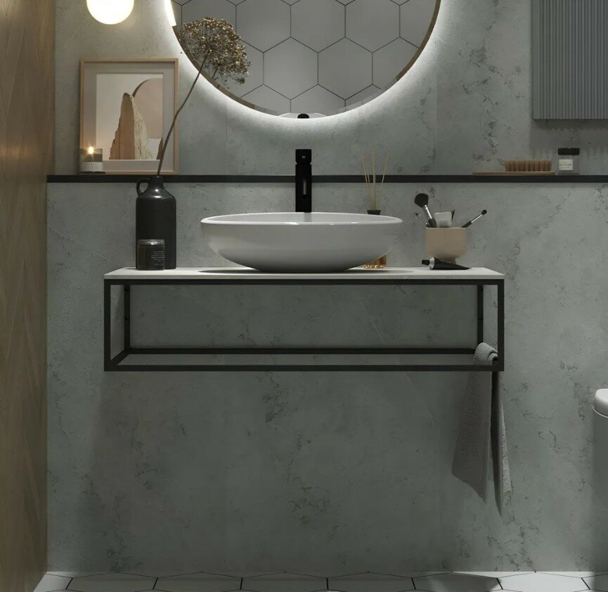 Столешница 1Marka LOFT 90 из керамогранита, светло-серый МА01 Nat Ц0000008736 - это стильное, функциональное и долговечное решение, которое подойдет для ванных комнат, исполненных в самых разнообразных отделочных материалах. Такая универсальность, тем не менее, предполагает высокую декоративную и эстетическую ценность столешницы - она делает обстановку в ванной комнате по-настоящему стильной и соответствующей актуальным тенденциям в дизайне. Металлическое подстолье создает эффектный цветовой контраст, а также может использоваться в качестве практичных рейлингов для удобного размещения полотенец и банных халатов. Приобретается отдельно: Раковина "Ringo Cut 53" Санита - Арт. У84088 , Раковина "Infinity 60" Санита - Арт. У84089 , Раковина Roll 53 Polytitan - Арт. У98808 , Раковина Elli 45 Polytitan - Арт. Ц0000008888