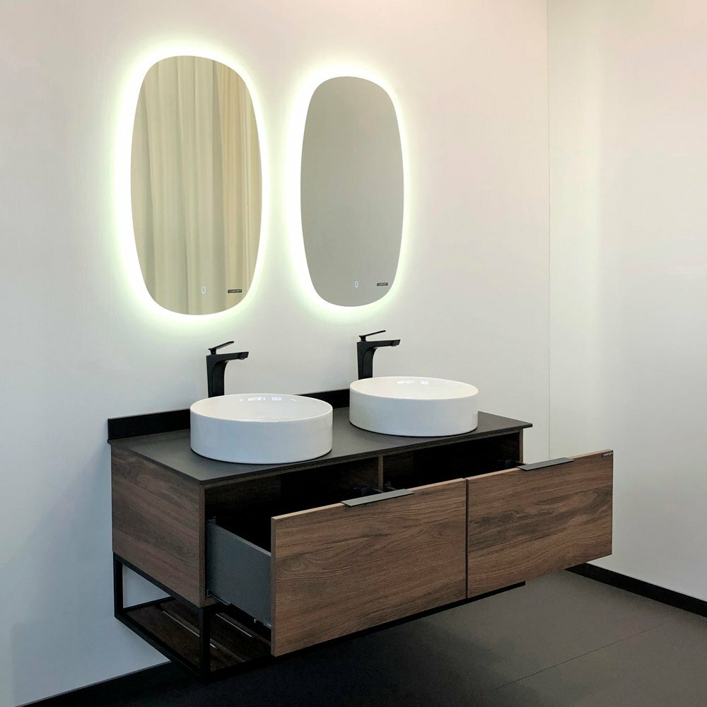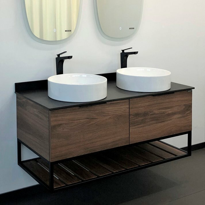Тумба привлекла мое внимание изящным дизайном и благородным цветом темного дуба. А две белые раковины красиво контрастируют с чёрной столешницей. Подвесная конструкция позволила расширить пространство ванной комнаты.