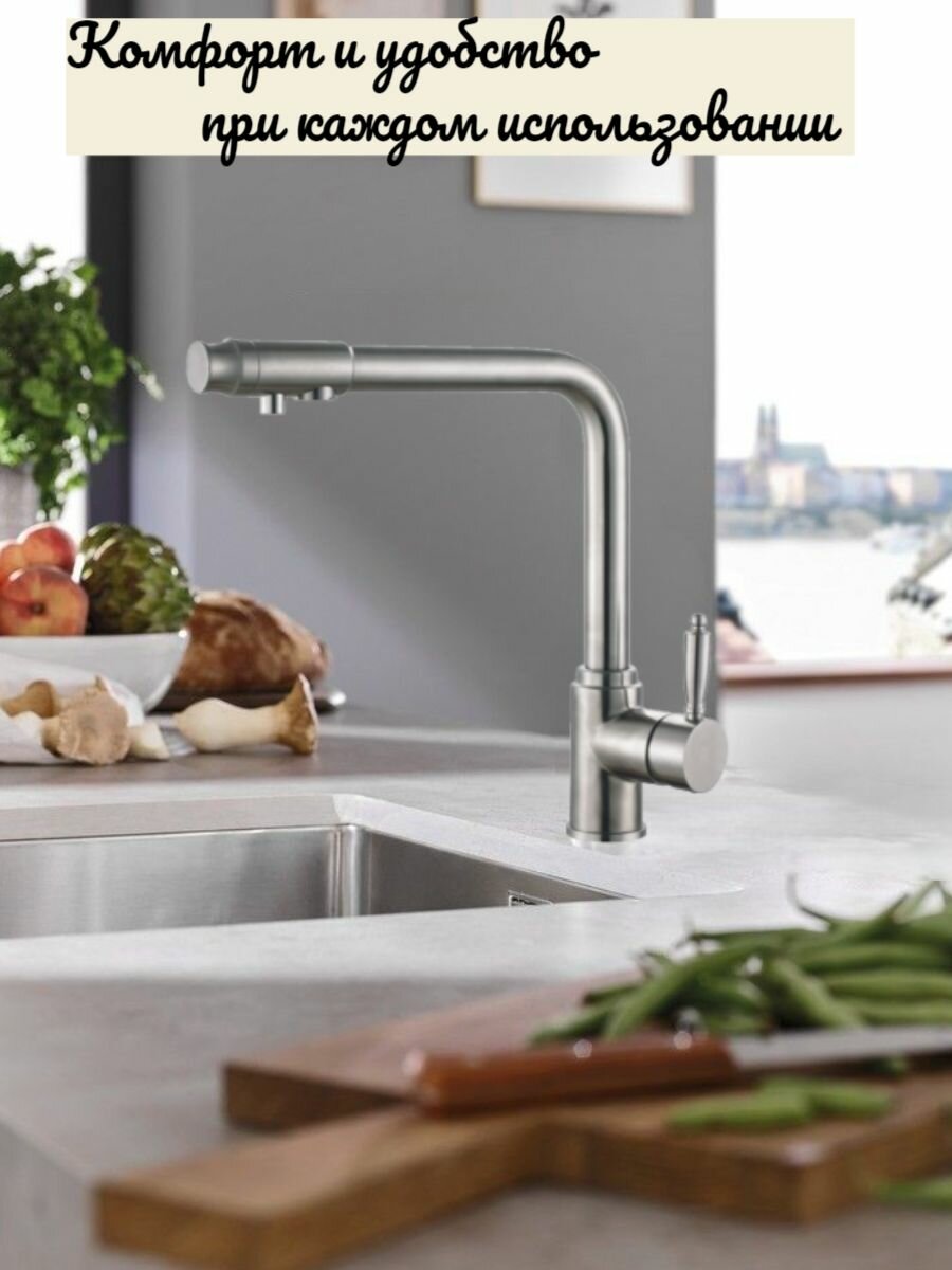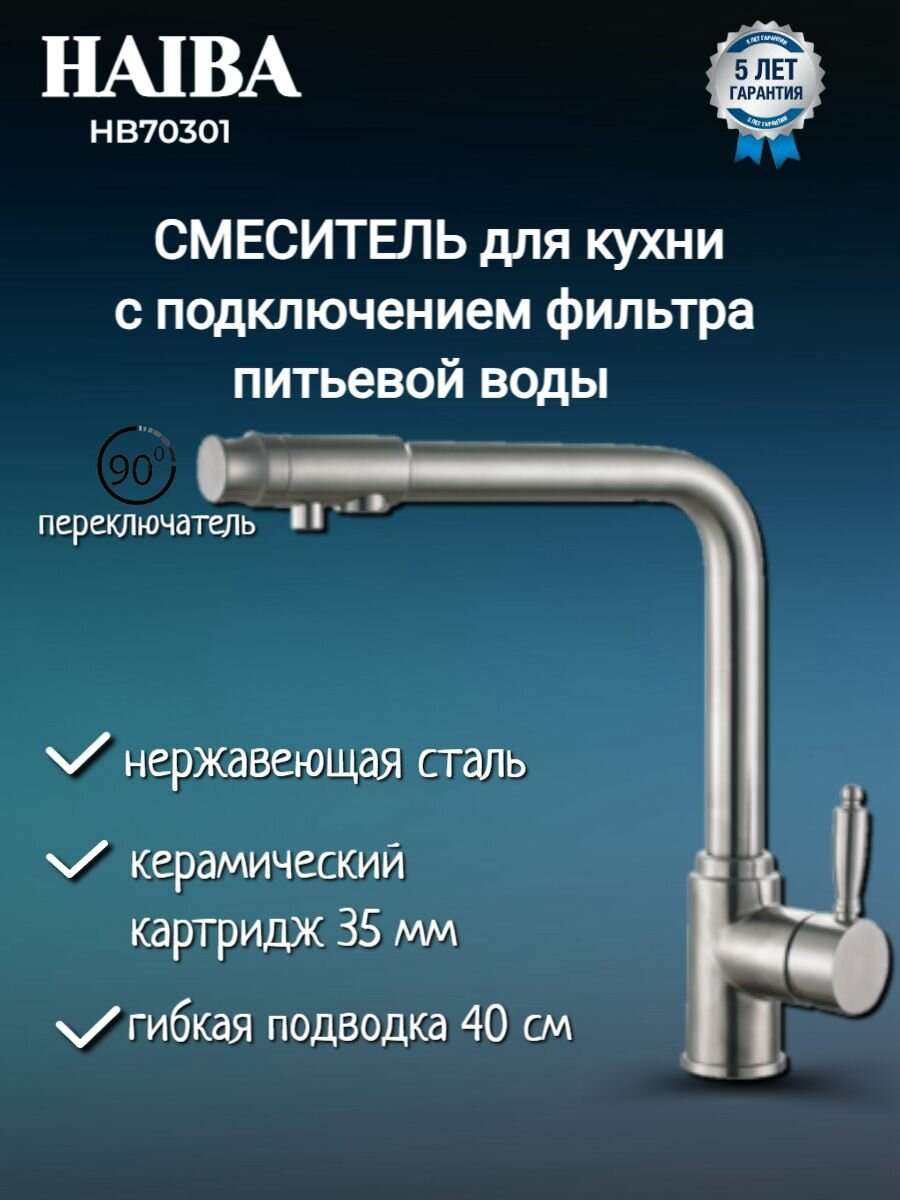 Смеситель Haiba HB70301 с подключением фильтра питьевой воды для кухни. Цвет: сталь. Рычажный смеситель предназначен для горизонтального крепления. Это универсальная модель, в современном стиле. Рычажный смеситель для кухни с поворотным изливом изготовлен из нержавеющей стали. Смеситель оборудован керамическим картриджем 35мм, который обеспечивает точную настройку напора воды. Поворотный излив оснащен комбинированным аэратором для водопроводной и питьевой воды. Стандарт подводки: 1/2. Крепление: гайка. Тип подводки: гибкая. Переходник для подключения шланга от фильтра с питьевой водой. Так же есть переключатель питьевой воды.Комплектация: смеситель, инструкция. Высокоточные линии литья и обработки, а также использование современных материалов позволяют гарантировать высокий уровень качества продукции. Продукция отличается хорошим соотношением цены и качества
