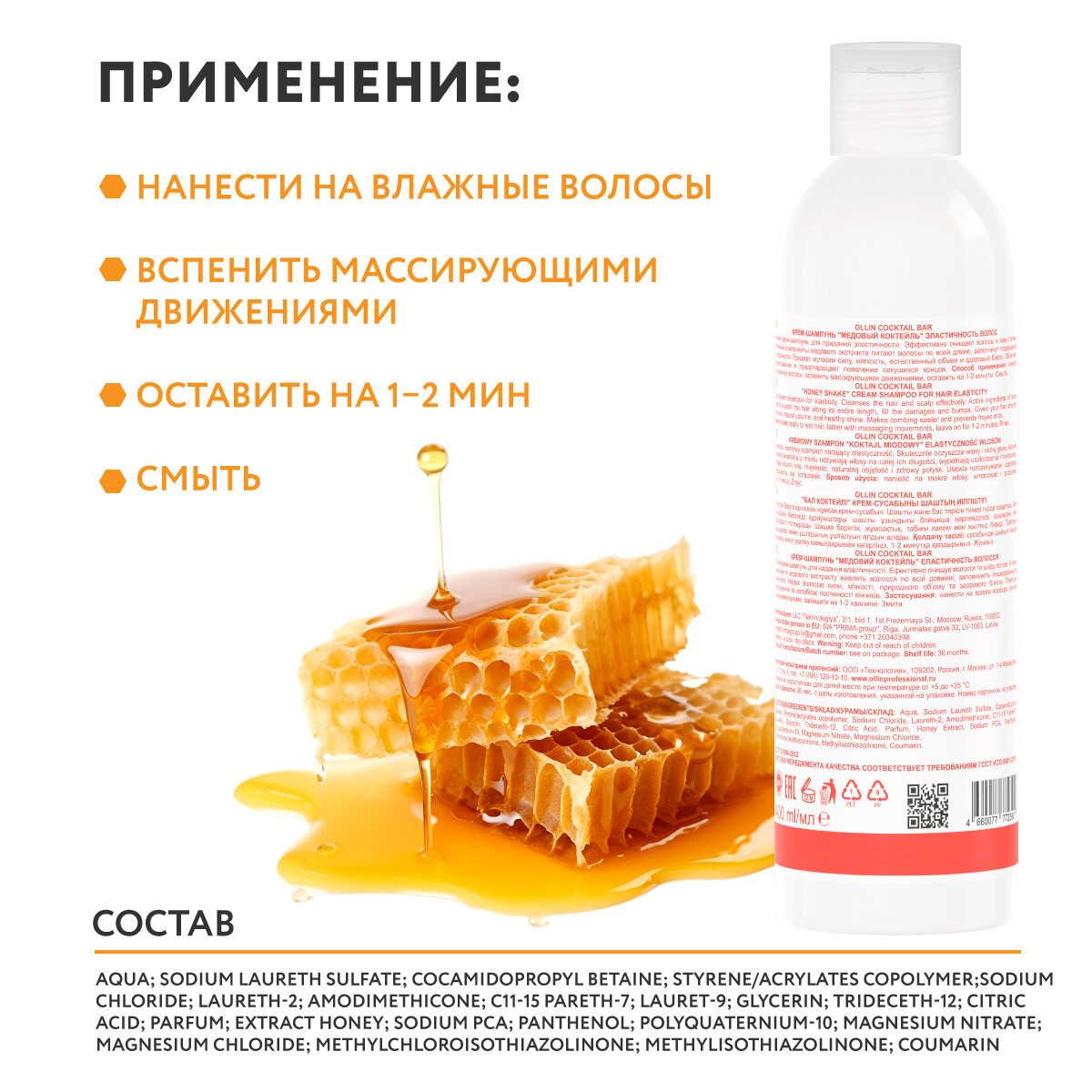 | Состав | Water; Sodium laureth sulfate; Cocamidopropyl Betaine; Laureth-2; Sodium chloride; Amodimethicone; C11-15 Pareth-7; Lauret-9; Glycerin; Trideceth-12; Styrene/acrylates copolymer; Extract Honey; Na-PCA; D-Panthenol; Fragrance; Polyquaternium-10; Citric acid; 5-chlor-2-methyl-4-isothiazolin-3-one; 2-methyl-4-isothiazolin-3-one; Benzyl Alcohol |