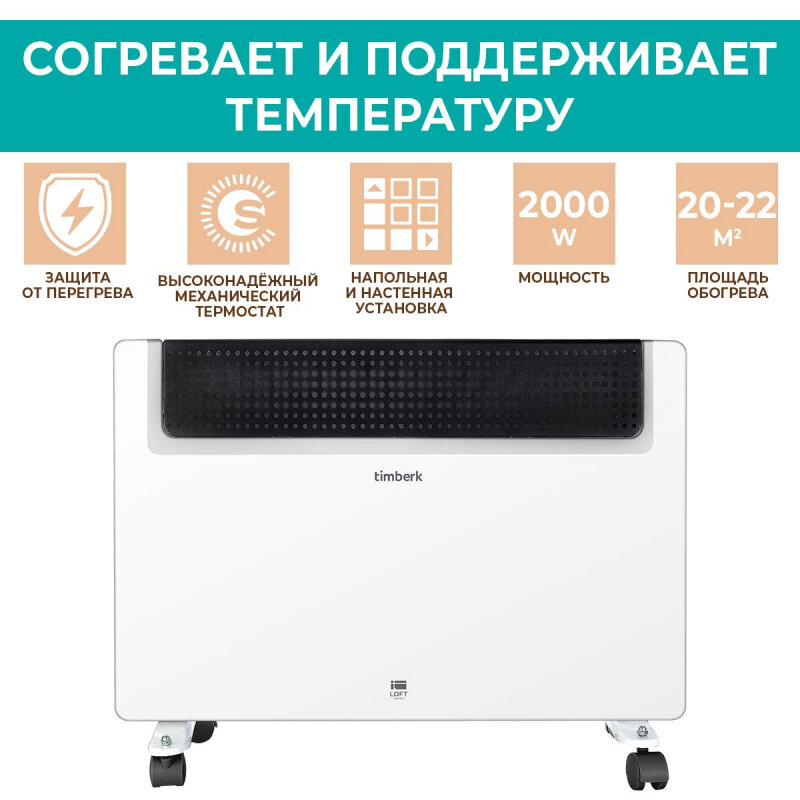 Конвектор Timberk может быть установлен на стену или на пол при помощи удобных ножек. Конвектор надежен и безопасен в использовании, чаще всего применяется для отопления небольших жилых, офисных или торговых пространств. Однако, если создать систему отопления из нескольких приборов, то так же эффективно можно обогреть помещение большой площади.