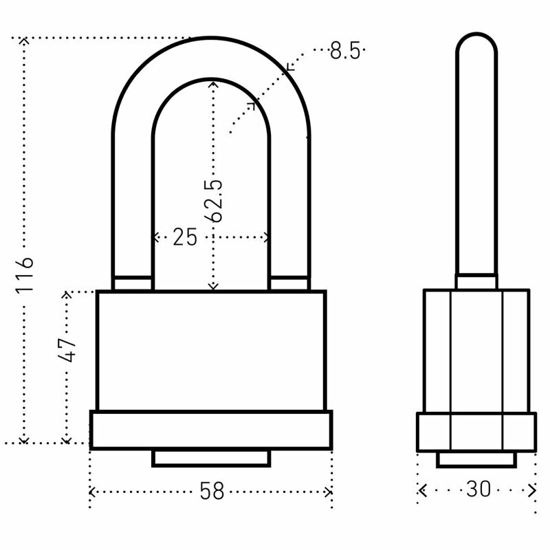 - Размеры корпуса - 58ммх47мм, диаметр дужки - 8,5мм.