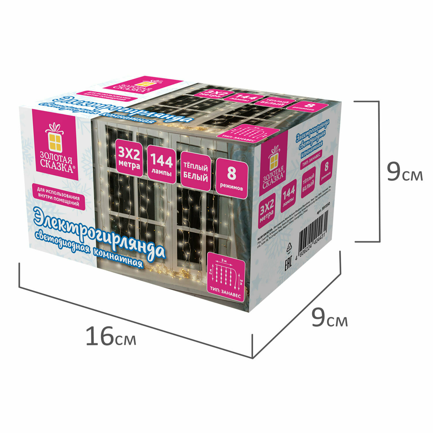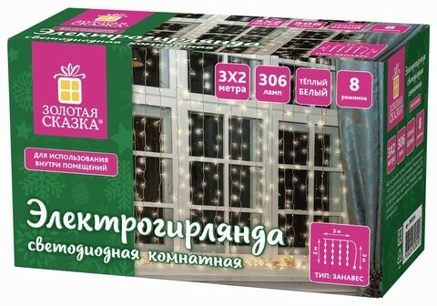 | Комплектация | Гирлянда светодиодная ЗАНАВЕС НА ОКНО, 3х2 м, 306 ламп, теплый белый, ЗОЛОТАЯ СКАЗКА, 591334 |