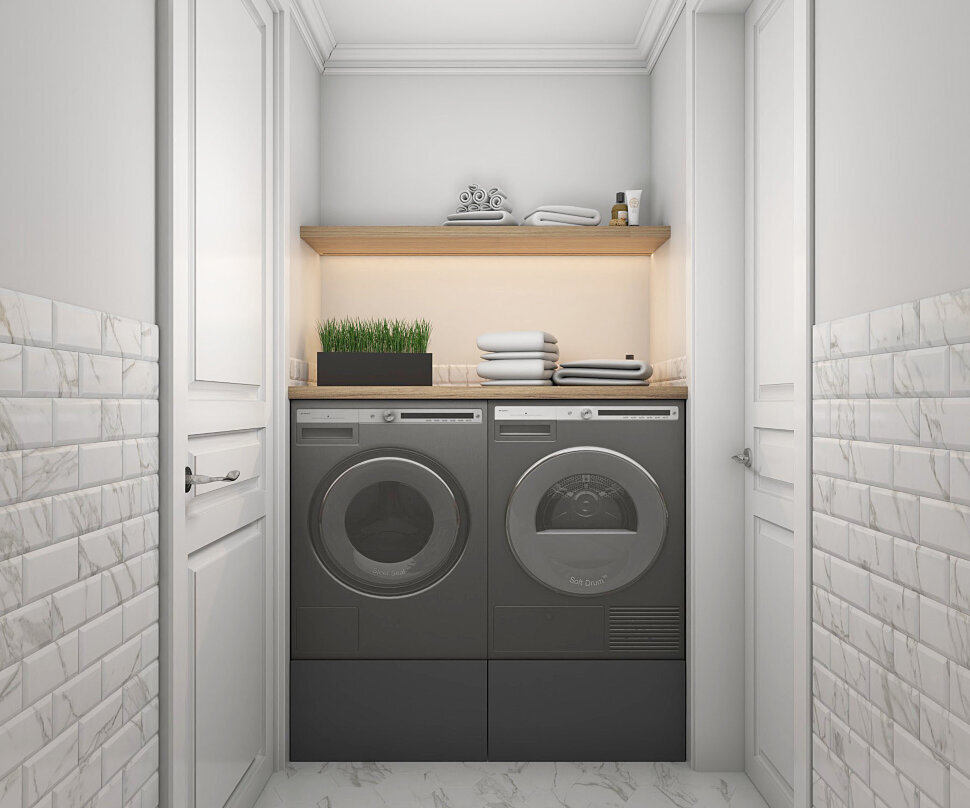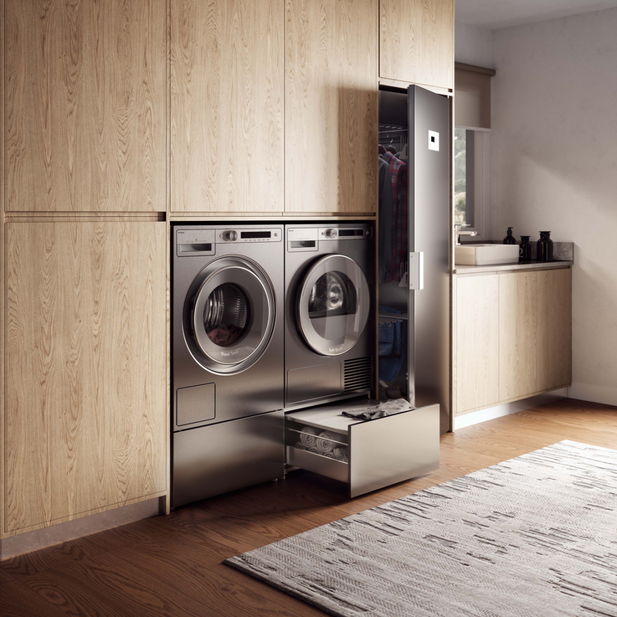Просторный напольный ящик для хранения моющих средств, вешалок, инструкций и других аксессуаров одновременно служит подставкой, благодаря которой стиральная или сушильная машина приподнимется на 30 см от пола для удобства загрузки и разгрузки.