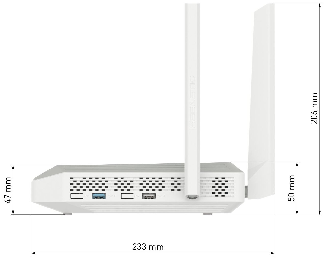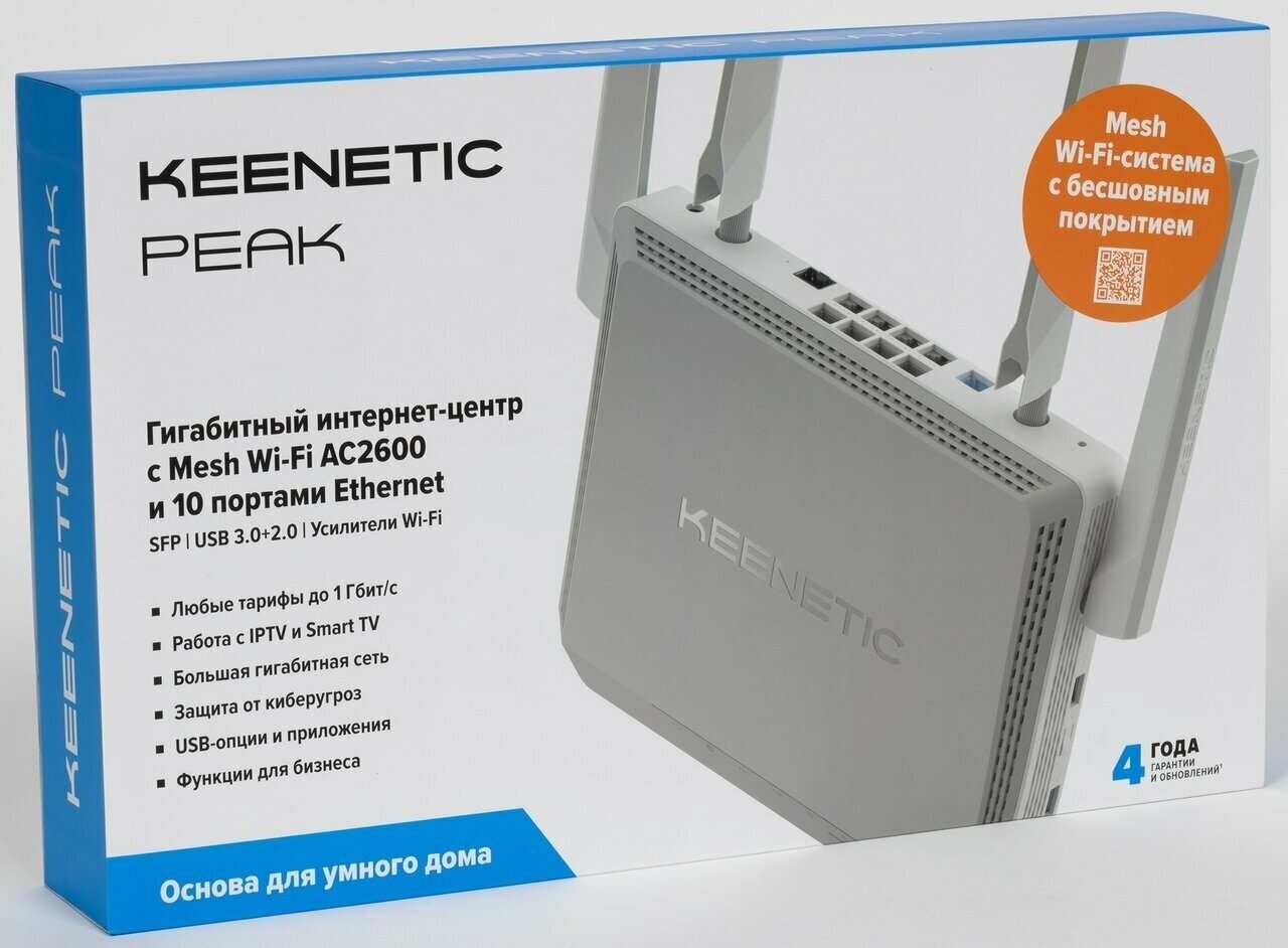 Wi-Fi-роутер Keenetic Peak белого цвета оснащен 2-ядерным процессором, поддерживающим высокую скорость беспроводного и проводного соединения. Благодаря своим техническим параметрам он подходит для развертывания сети в большой квартире, доме или офисе. Роутер поддерживает беспроводное подключение 3G и 4G/LTE (требуется USB модем). Внешние съемные антенны (4 шт.) с усилением в 5 dBi создают бесперебойный сигнал при работе устройства в двух диапазонах (2.4 ГГц, 5 ГГц). Максимальная скорость беспроводного соединения Wi-Fi-роутера Keenetic Peak с другими устройствами составляет 2533 Мбит/с. При этом технология многопотоковой передачи данных MU-MIMO предусматривает одновременное подключение большого количества устройств к роутеру без потери скорости соединения. Для проводного подключения на корпусе роутера имеются 8 LAN-портов (1000 Мбит/с). Два USB-разъема (USB 2.0, USB 3.0) обеспечивают возможность из использования в качестве DLNA-или FTP-сервера, Torrent-клиента.