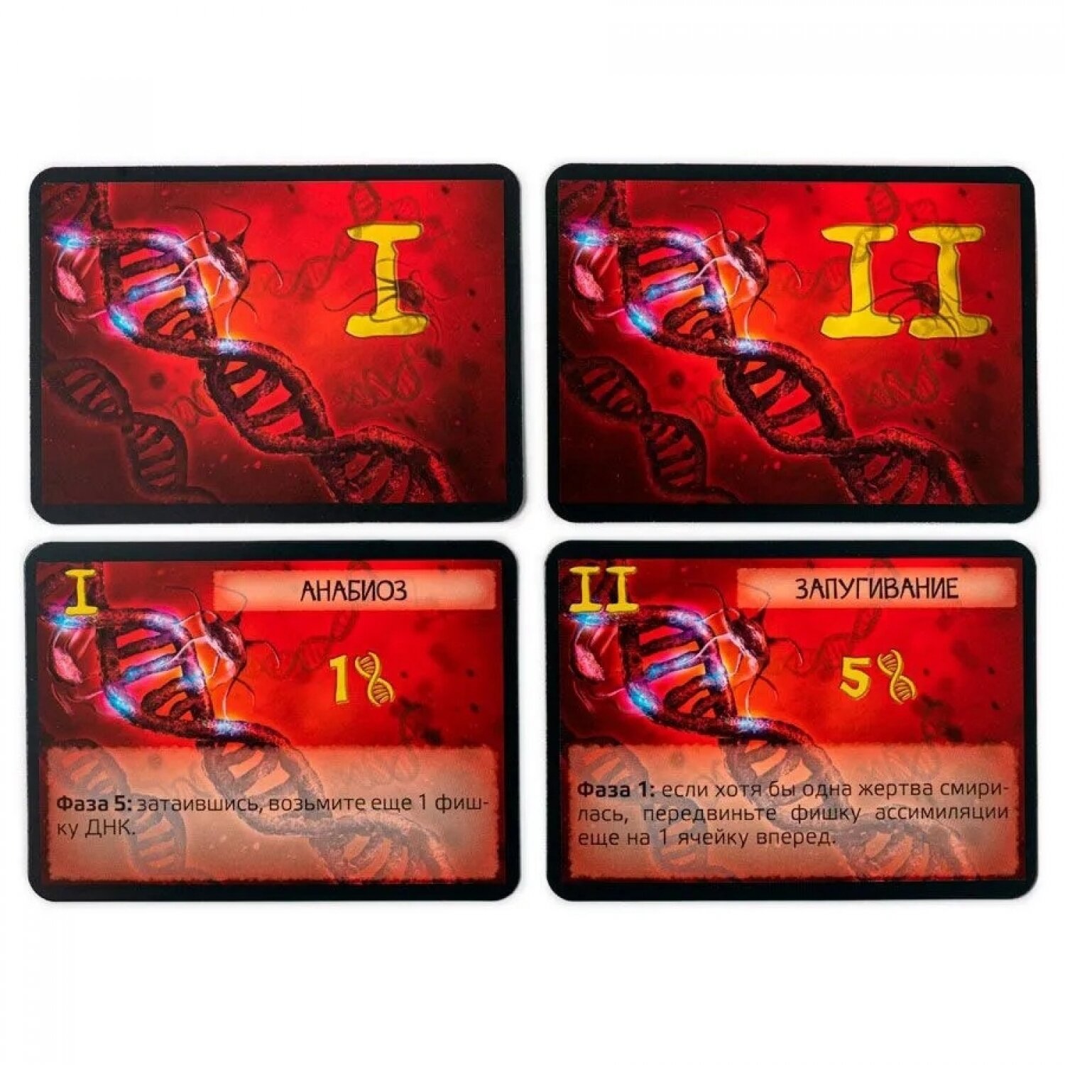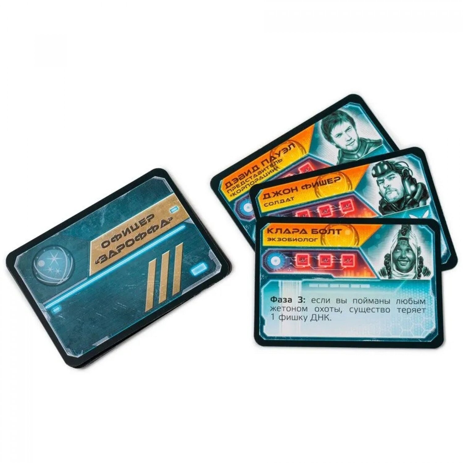 Существо тоже меняет тактику. Теперь в его распоряжении – две колоды карт адаптаций, которые оно может активировать и развивать с помощью фишек ДНК. Каждая карта даёт новые силы и возможности, делая существо всё более опасным противником для астронавтов, а карты охоты ни на миг не позволяют им расслабиться.