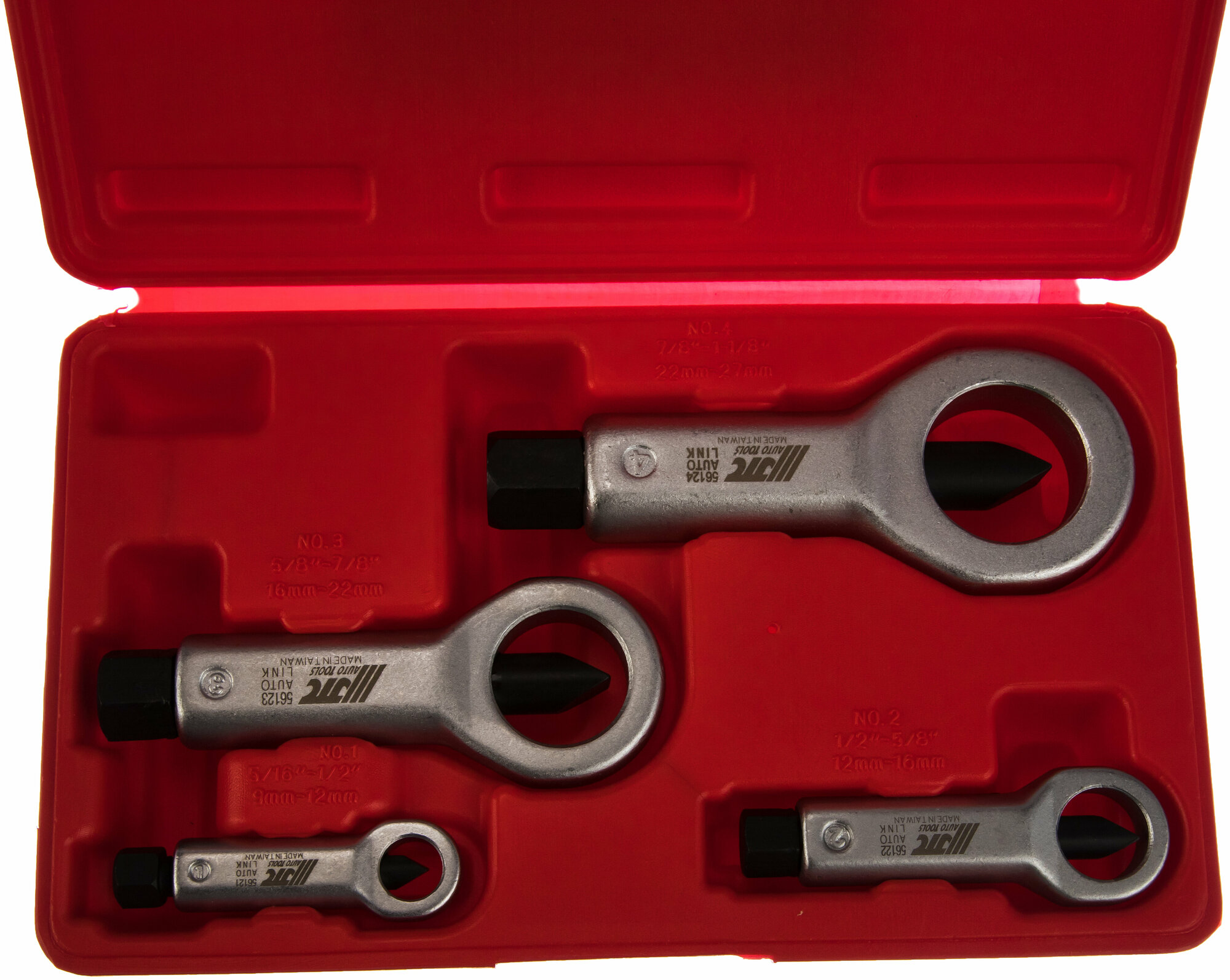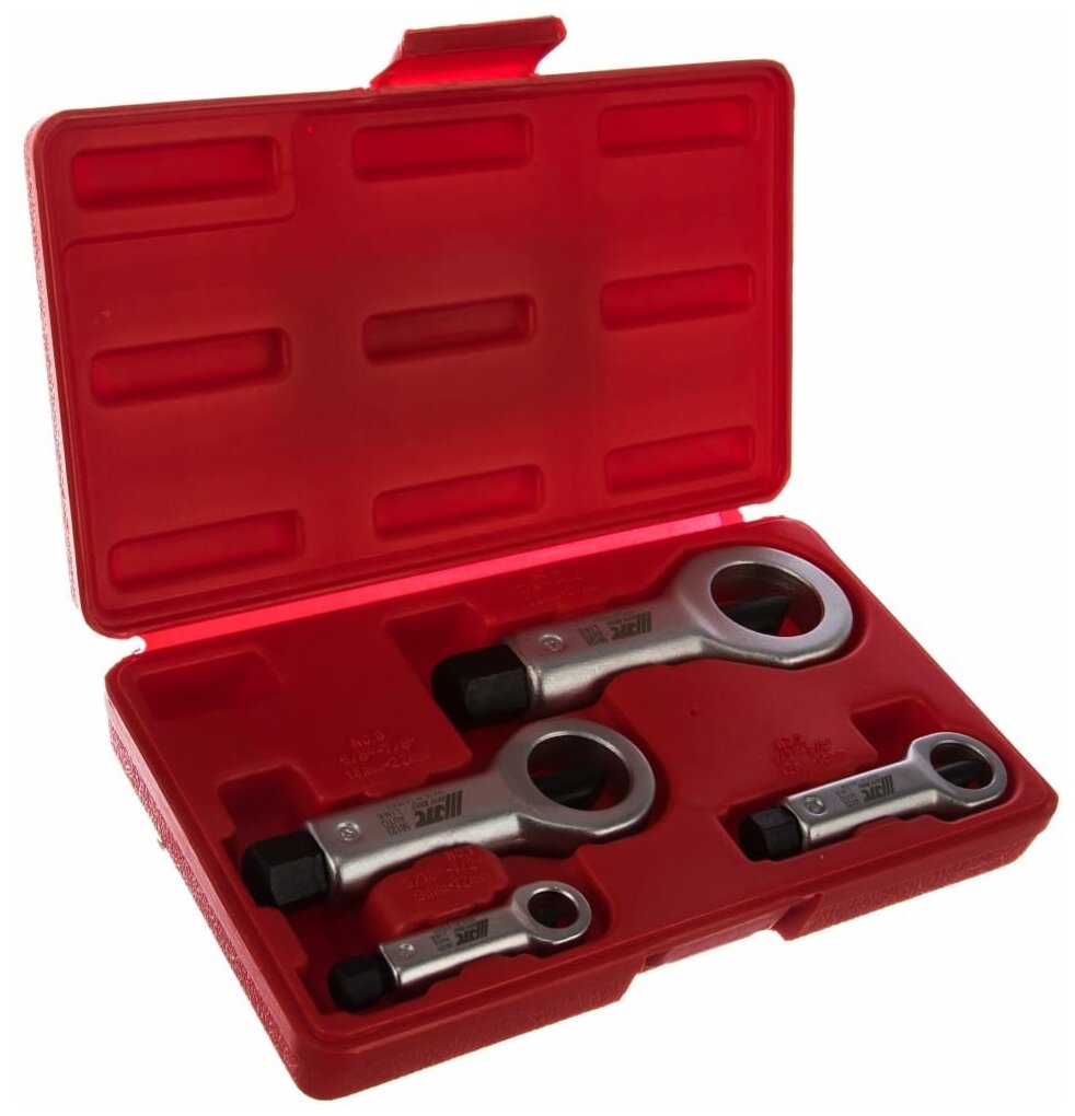 Набор гайкорубов JTC JTC-5612 состоит из четырёх предметов и предназначен для работы с гайками диаметром 9–27 мм. В комплект входят инструменты для работы с гайками размеров 15/16"-11/8".Преимущества Прочность и долговечность: конструкция инструментов выполнена из качественных материалов, что обеспечивает долгий срок службы Простота использования: каждый инструмент имеет своё специальное углубление в кейсе, что облегчает поиск и хранение Универсальность: набор подходит для работы с различными видами крепежа, что делает его полезным инструментом для автомастерских и ремонтных работ Удобство использования: габариты набора составляют 250x150x50 мм, что позволяет легко транспортировать его и хранить