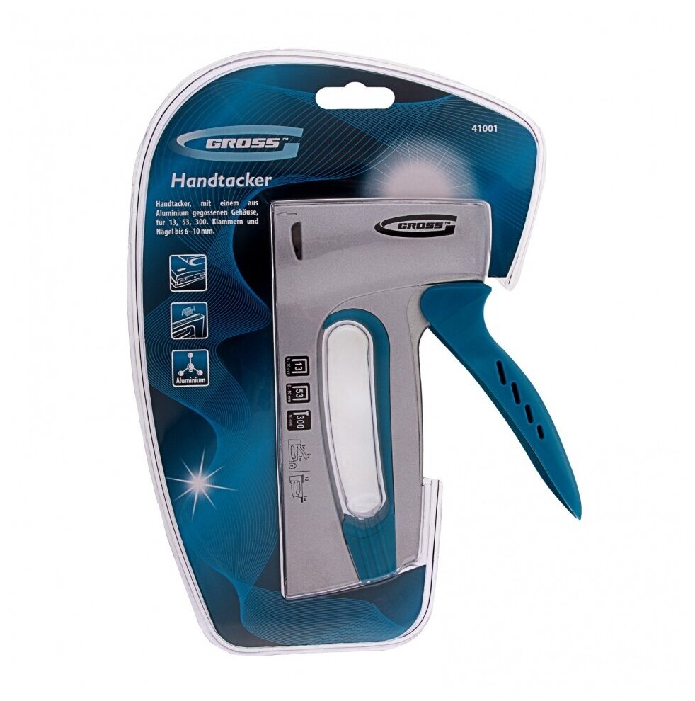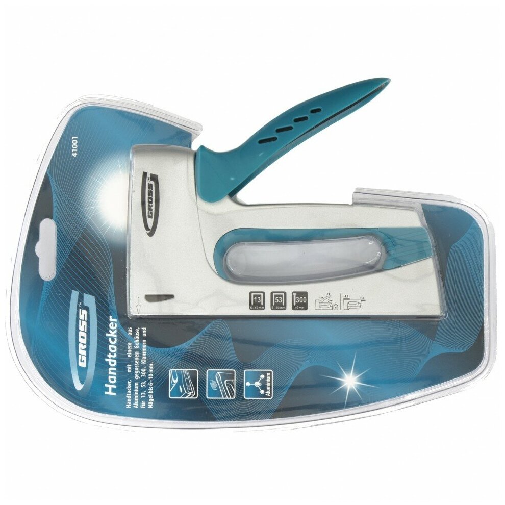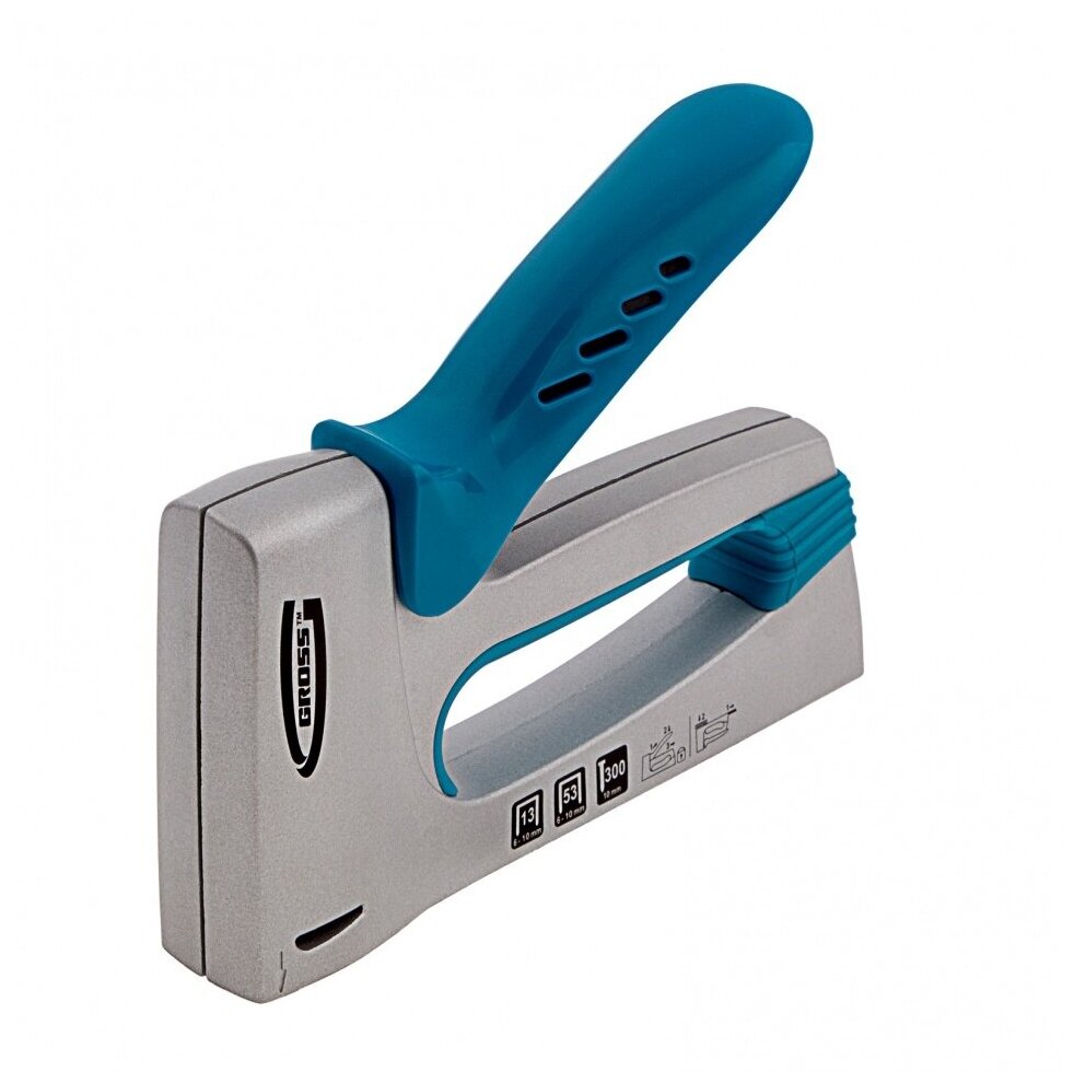 Мебельный степлер Gross 41001 в алюминиевом корпусе работает со скобами типа 13 и 53 размером 6-10 мм и гвоздями типа 300 размером 10 мм. Позволяет крепить к деревянным основаниям листовые материалы из фанеры, оргалита, ДВП, ДСП, а также пленку и утеплитель. Используется для сборки и обшивки мебели, укладки напольных покрытий, выполнения теплоизоляционных и багетных работ. Сбалансированная конструкция позволяет минимизировать отдачу и снизить нагрузку на кисть. Степлер обладает значительным запасом прочности и рекомендован для профессиональных работ.