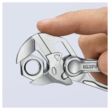 86 04 100 Клещи – гаечный ключ XS Оптимальный доступ даже в ограниченных простран-ствах: чрезвычайно компактная конструкция с оченьтонкой головкой. Точная настройка одной рукой для простой адаптации к любым размерам деталей. Экстремальная захватывающая способность при длине инструмента всего 100 мм: мягкое разведение губок обеспечивает непрерывный захват с шириной захвата до 21 мм. . Гладкие губки для бережного монтажа чувствительных фитингов и деталей с деликатной обработкой поверхности: можно использовать непосредственно на хроме благодаря гладкому контакту по всей площади поверхности. Разнообразные области применения: точное машиностроение, сантехника, неотъемлемая часть любого набора инструментов для обслуживания велосипеда или мотоцикла, повседневное бытовое применение, изготовление моделей. Защита от защемления пальцев. Точная настройка с 10 дискретными положениями. - Позиции установки: 10 - Диапазон для гаек, размер под ключ: Ø 034 - Диапазон для гаек, размер под ключ: 21mm