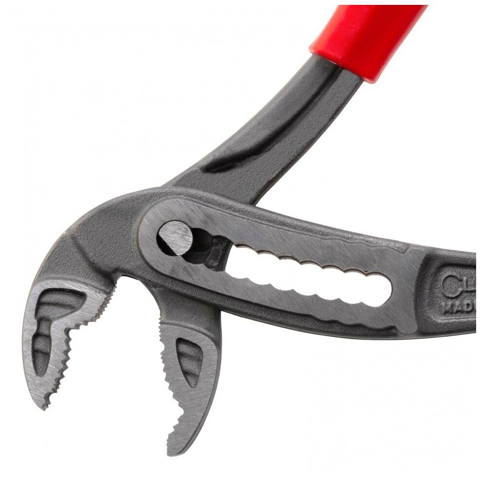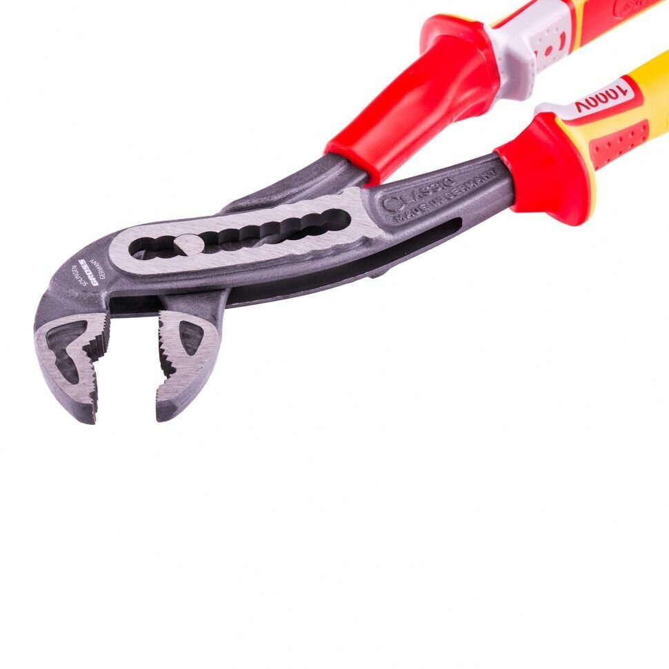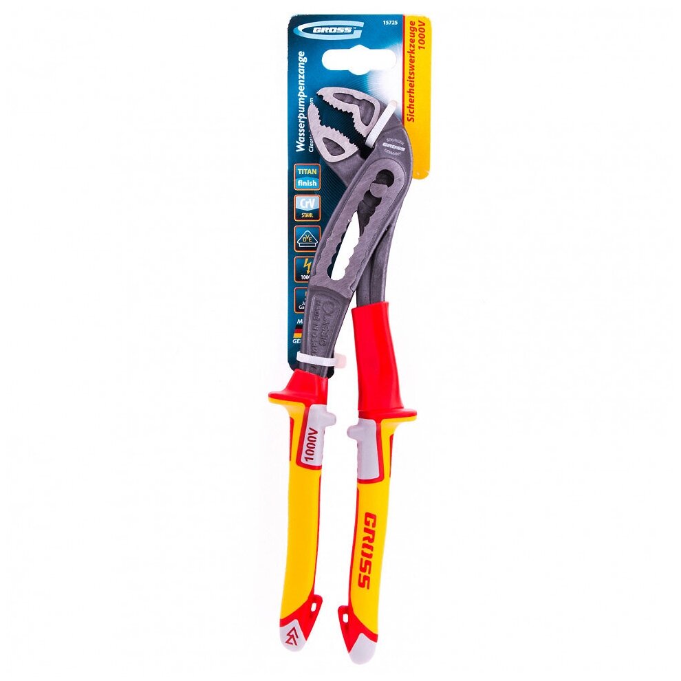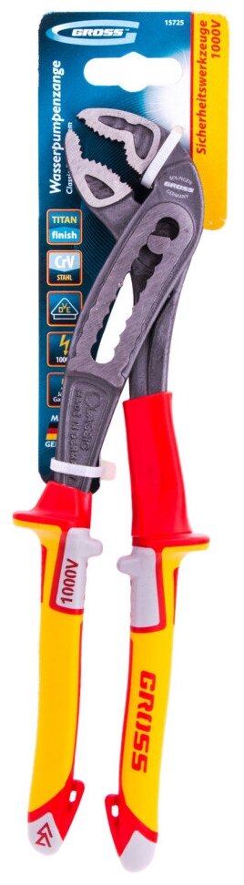Клещи переставные торговой марки GROSS предназначены для вращения и фиксации труб, фитингов и прочих слесарно-монтажных работ. Инструмент оснащен рукоятками с диэлектрическими свойствами (до 1000 В, стандарт VDE). На зажимных поверхностях губок присутствует паз для захвата и удержания гвоздей, проволоки. За счет небольшого изгиба направляющих и смещения нижней рукоятки относительно шарнира можно осуществлять уверенный захват предметов размером до 50 мм. Изготовлены клещи из инструментальной хромованадиевой стали (CrV). Обливные обрезиненные рукоятки позволяют надежно удерживать инструмент в руке. 5 лет гарантии на заводской брак.