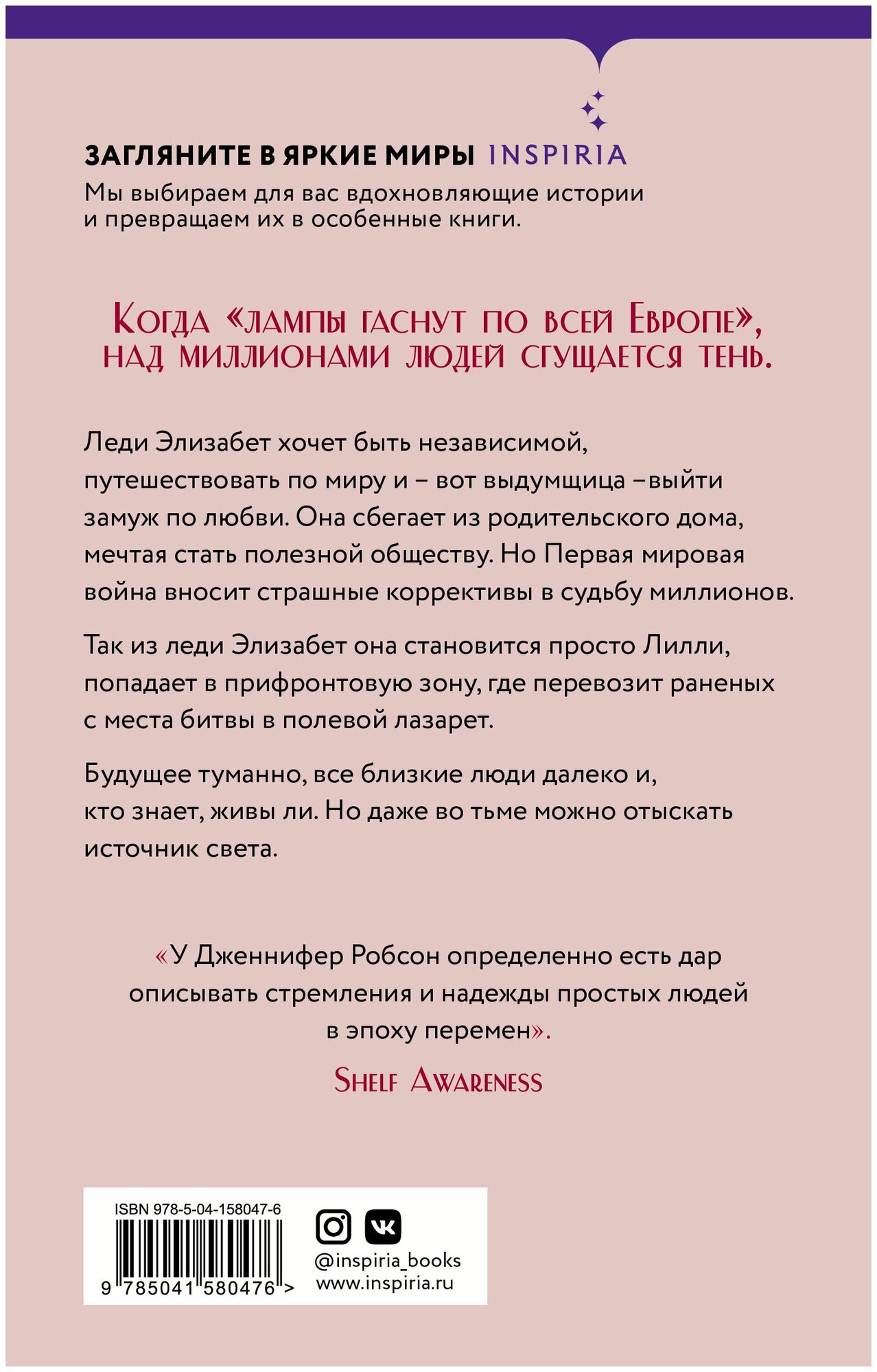 Мне нравятся романы Робсон потому, что она изящно вплетает личные конфликты в канву истории, делая свои книги многомерными и любопытными для широкого круга читателей. Например, в этой книге найдется много чего интересного и душераздирающего про Первую мировую войну, но в то же время мы всегда будем рядом с Лилли, а точнее Леди Элизабет, которая будет пытаться строить свою жизнь в военном аду. Вместе с ней мы пройдем путь женщины с разбитым сердцем, которая сумеет восстать из пепла.