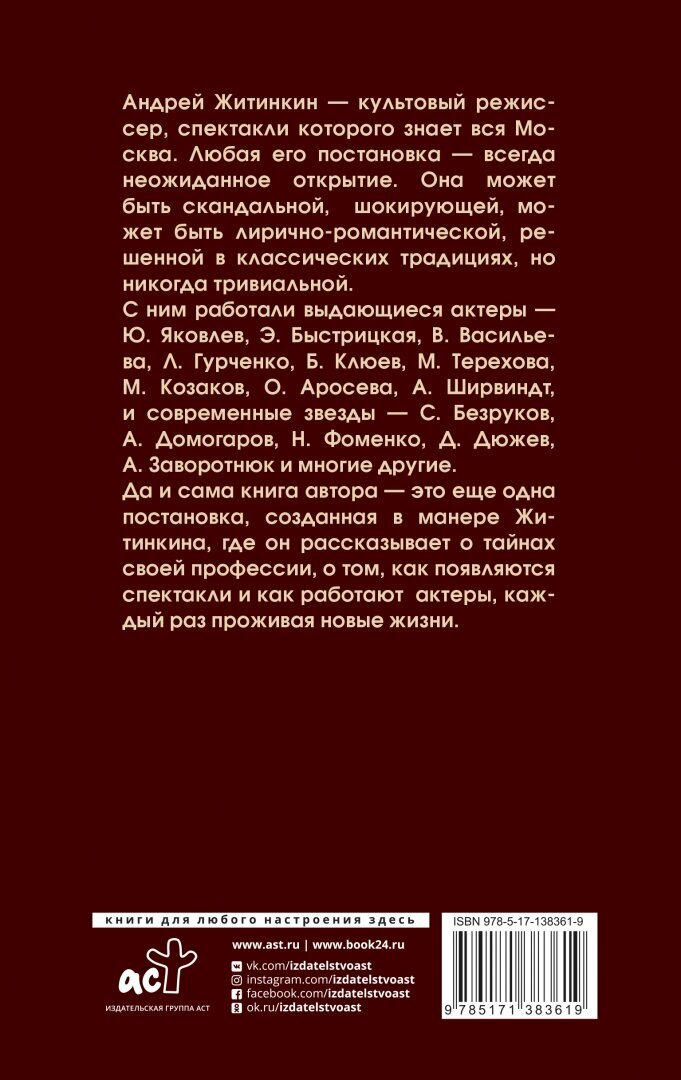 Да и сама книга автора - это еще одна постановка, созданная в манере Житинкина, где он рассказывает о тайнах своей профессии, о том, как появляются спектакли и как работают актеры, каждый раз проживая новые жизни.