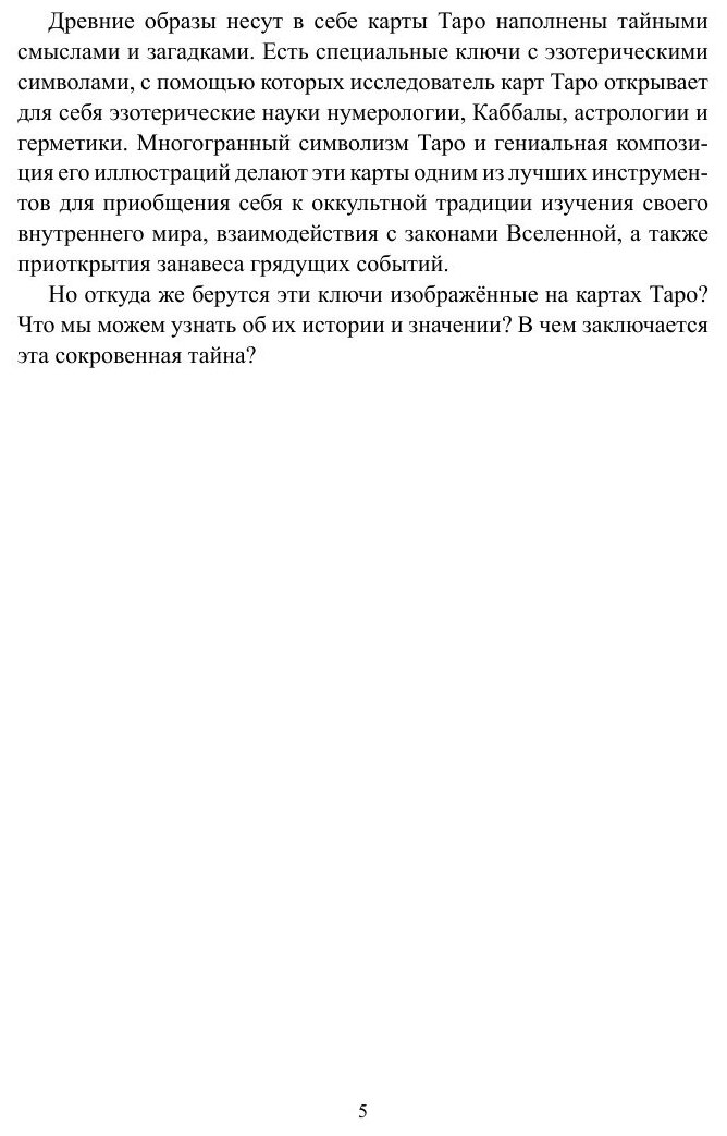 Работа с предсказательной системой – карты Таро, является пожалуй, самым популярным на сегодняшний день способом просмотра сложившихся проблемных ситуаций, они являются главным инструментом, заметной частью современной культуры. Эта книга рассказывает об истории возникновения колоды, её совершенствования, объясняет символизм карт Таро на базе современной психологии, помогает понять их язык, а также учит использовать карты для самоанализа, психотерапии и простейшего прогноза своей судьбы.