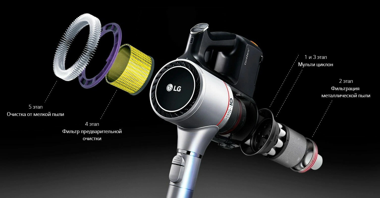 Вертикальный пылесос LG создан для того, чтобы уборка стала удовольствием. Этот прибор не зависит от розетки, а с легкостью передвигать его перед собой по дому сможет даже ребенок! Если вы считаете, что вашим детям пора доверить уборку – то представленная модель поможет им эффективнее справляться с обязанностями. Она не нуждается в подзарядке до 50 минут. Все загрязнения отправляются в съемный контейнер объемом 0.44 л, а фильтр тонкой очистки позаботится о том, чтобы самые мелкие из них не попали обратно наружу. При необходимости эффективно и быстро очистить что-либо можно задействовать интенсивный и усиленный режимы пылесоса LG .