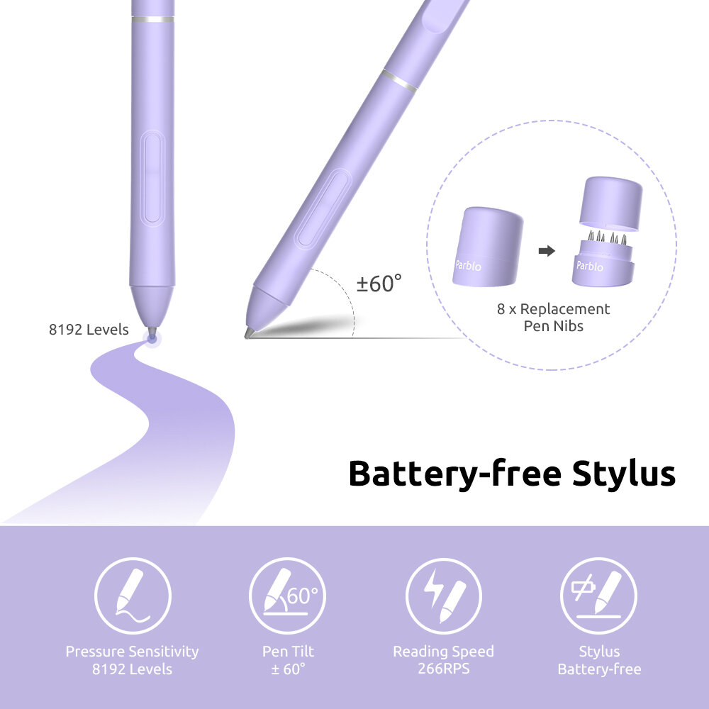 Планшет Parblo Intangbo предназначен для опытных художников. Обладает 8 горячими клавишами и кольцом. Все клавиши легко настраиваются. Данная модель использует инновационную технологию беспроводной пассивной электромагнитной индукции и поддерживает определение наклона пера до 60°. Разрешение рабочей области 5080 LPI, скорость отклика пера 266 PPS, 8192 уровней нажатия. Планшет работает не только в операционных системах Windows и macOS, но и совместим со смартфонами на Android.