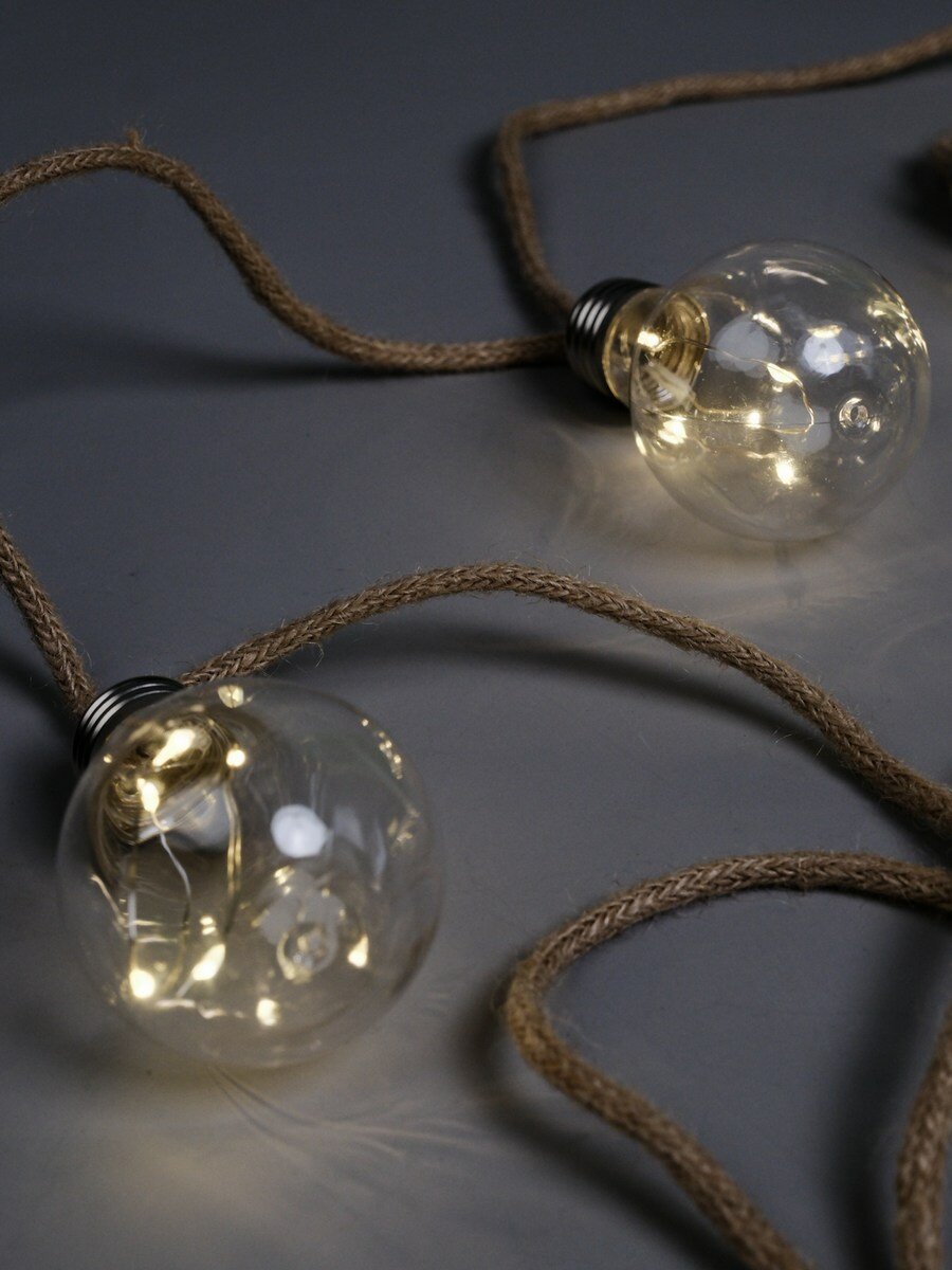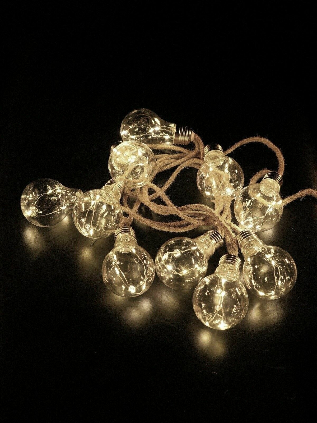 Светодиодная электрогирлянда на веревке из джута с насадками-лампочками с теплыми белыми светодиодами. Оригинальная декорация отлично подойдет для украшения помещений типа лофт, а именно окон, витрин, стен и т.д. Гирлянда предназначена для использования внутри помещения.
