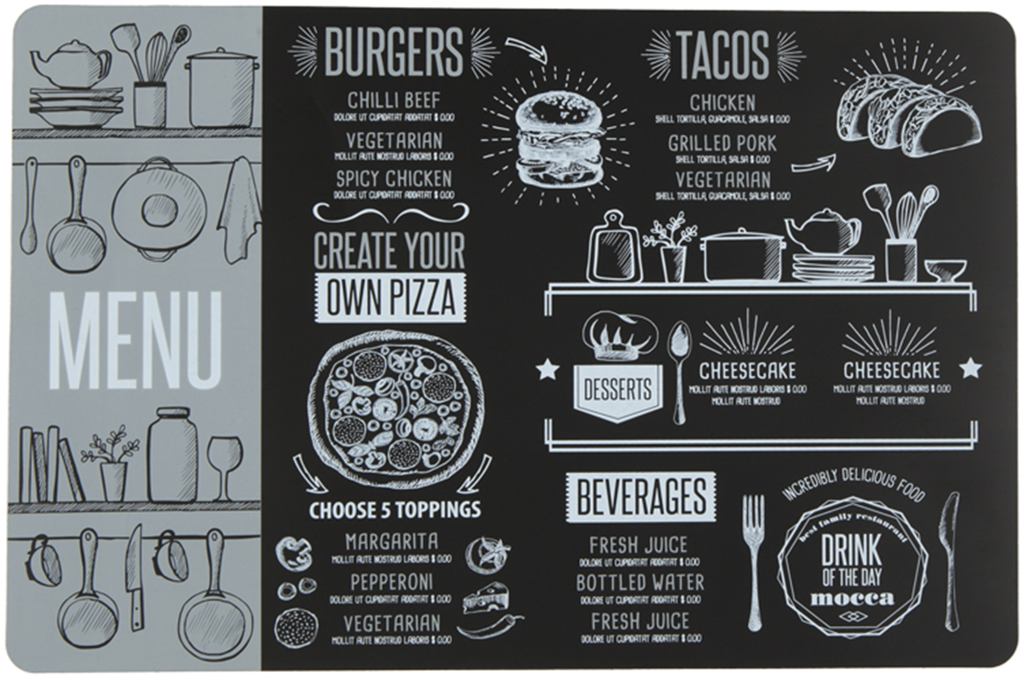 **Салфетка сервировочная Меню** предназначена для защиты поверхности стола от горячих предметов, проливания жидкости. Выполняет декоративную функцию.