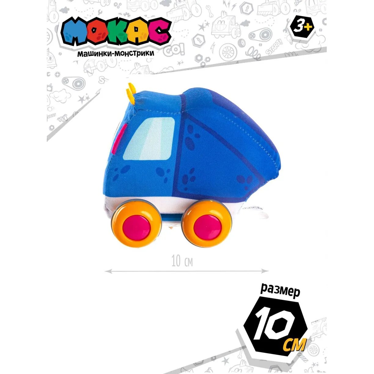 Текстильная мягкая машинка в форме персонажа мультфильма. Мягкий корпус закреплен на пластиковой базе с колесами при помощи липучки. Машинка инерционная. Длина 11 см