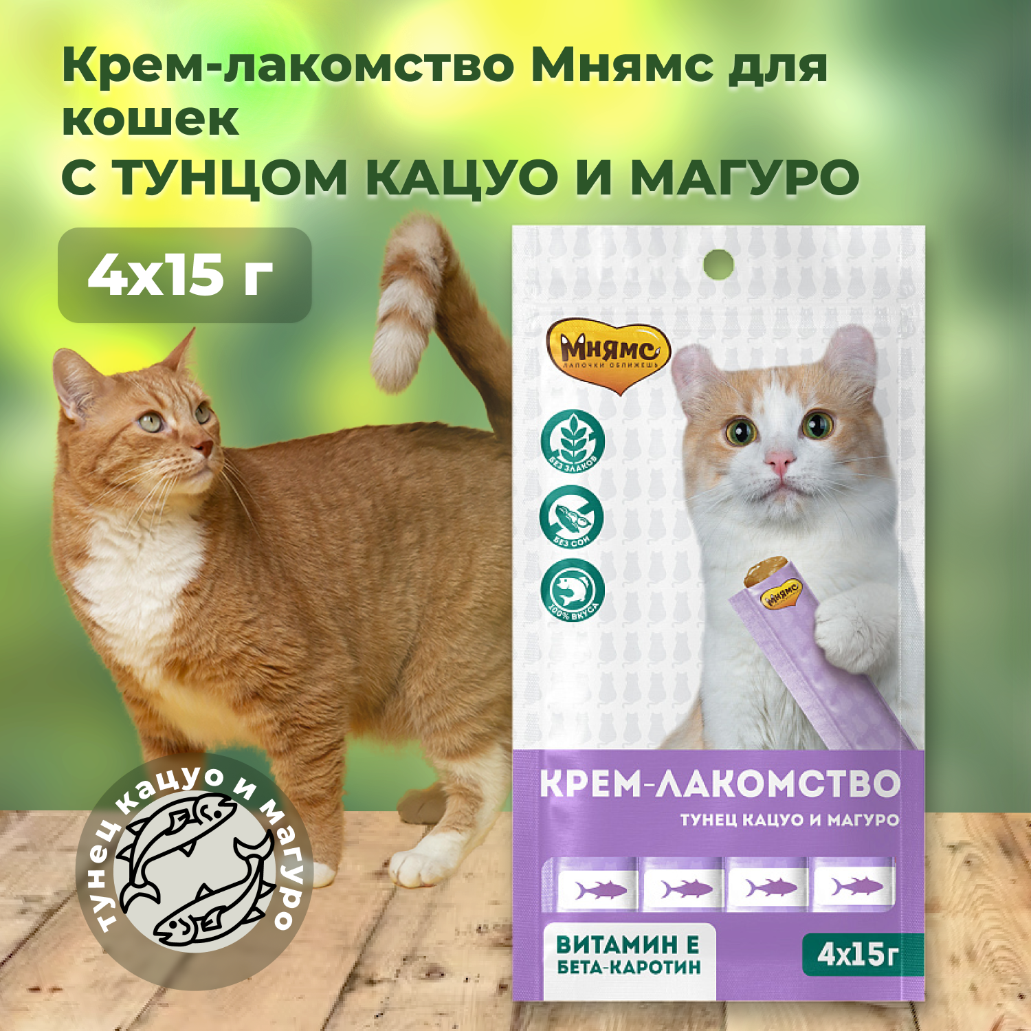 Тёмно-красное мясо деликатесного малого тунца и красное стейковое мясо желтопёрого тунца. Крем-лакомство "Мнямс" с тунцом - это изысканное угощение с нежнейшей кремовой консистенцией. Утонченный вкус приводит кошек в восторг, а яркие эмоции довольных любимцев при кормлении с рук дарят хозяевам ощущение полного счастья. Подается как порционное угощение, или добавляется в виде аппетитного соуса к основному рациону для обогащения вкуса привычных блюд. Изготовлено по новейшей японской технологии и соответствует
