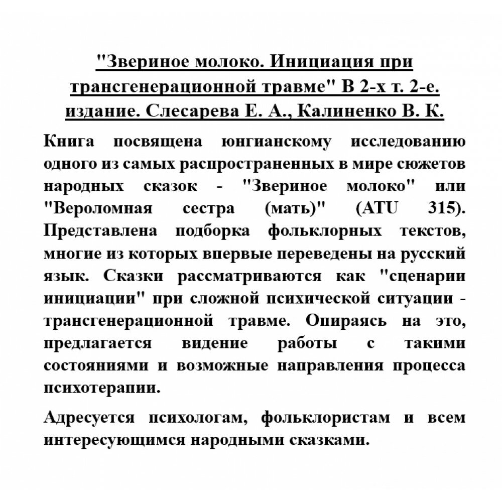 Книга посвящена юнгианскому исследованию одного из самых распространенных в мире сюжетов народных сказок - "Звериное молоко" или "Вероломная сестра (мать)" (ATU 315). Представлена подборка фольклорных текстов, многие из которых впервые переведены на русский язык. Сказки рассматриваются как "сценарии инициации" при сложной психологической ситуации - трансгенерационной травме. Опираясь на это, предлагается видение работы с такими состояниями и возможные направления процесса психотерапии. Адресуется психологам, фольклористам и всем интересующимся народными сказками.