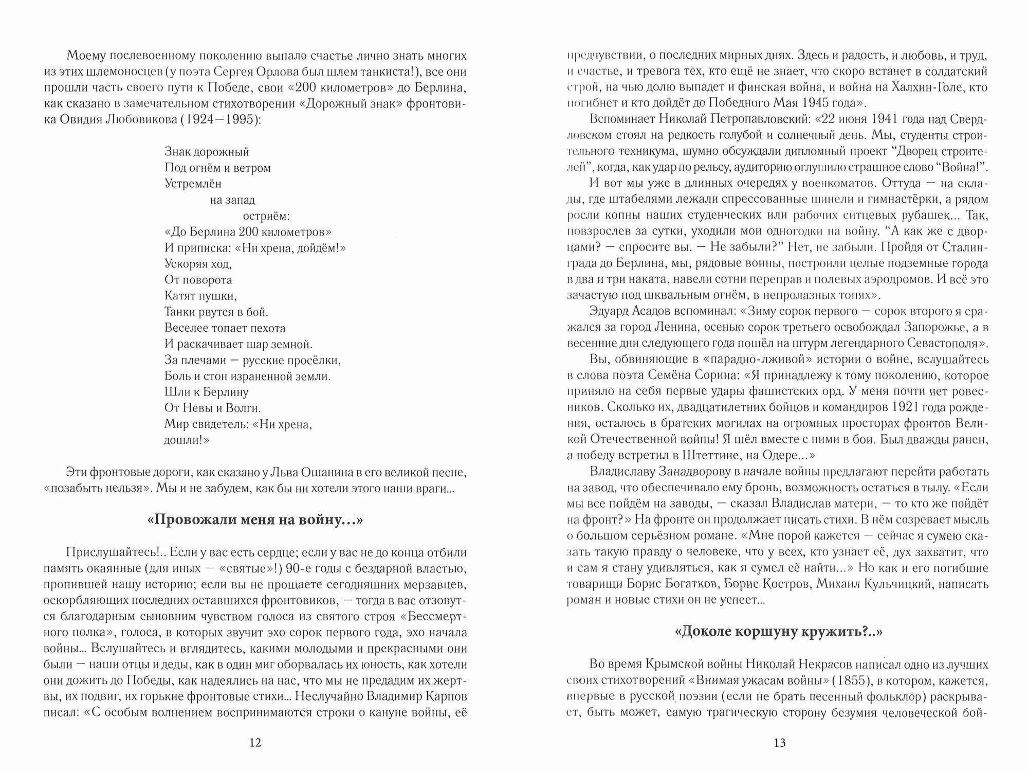 Поэтам и прозаикам фронтовикам посвящены эссе о Ю. Друниной, Евг. Винокурове, К. Ваншенкине, С. Наровчатове, Н. Старшинове, К. Воробьёве.