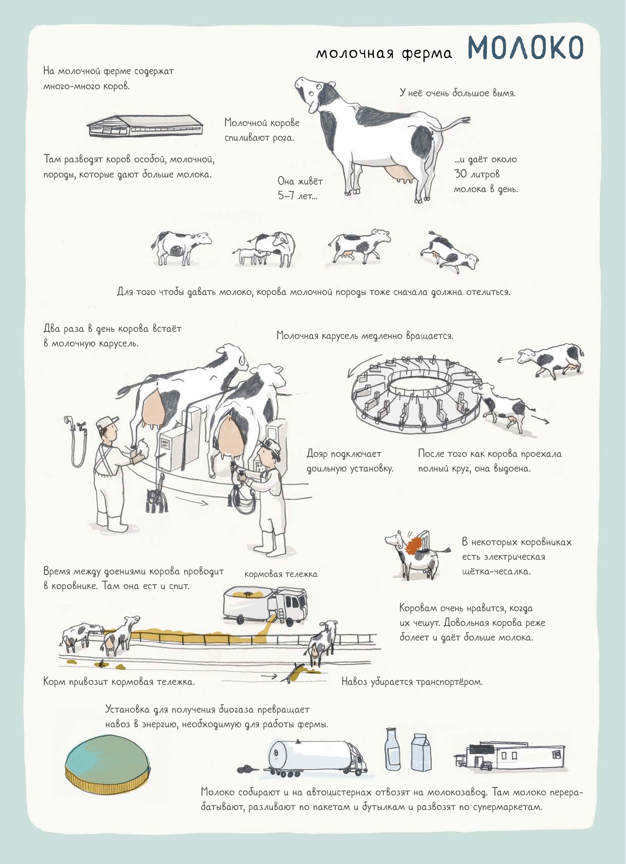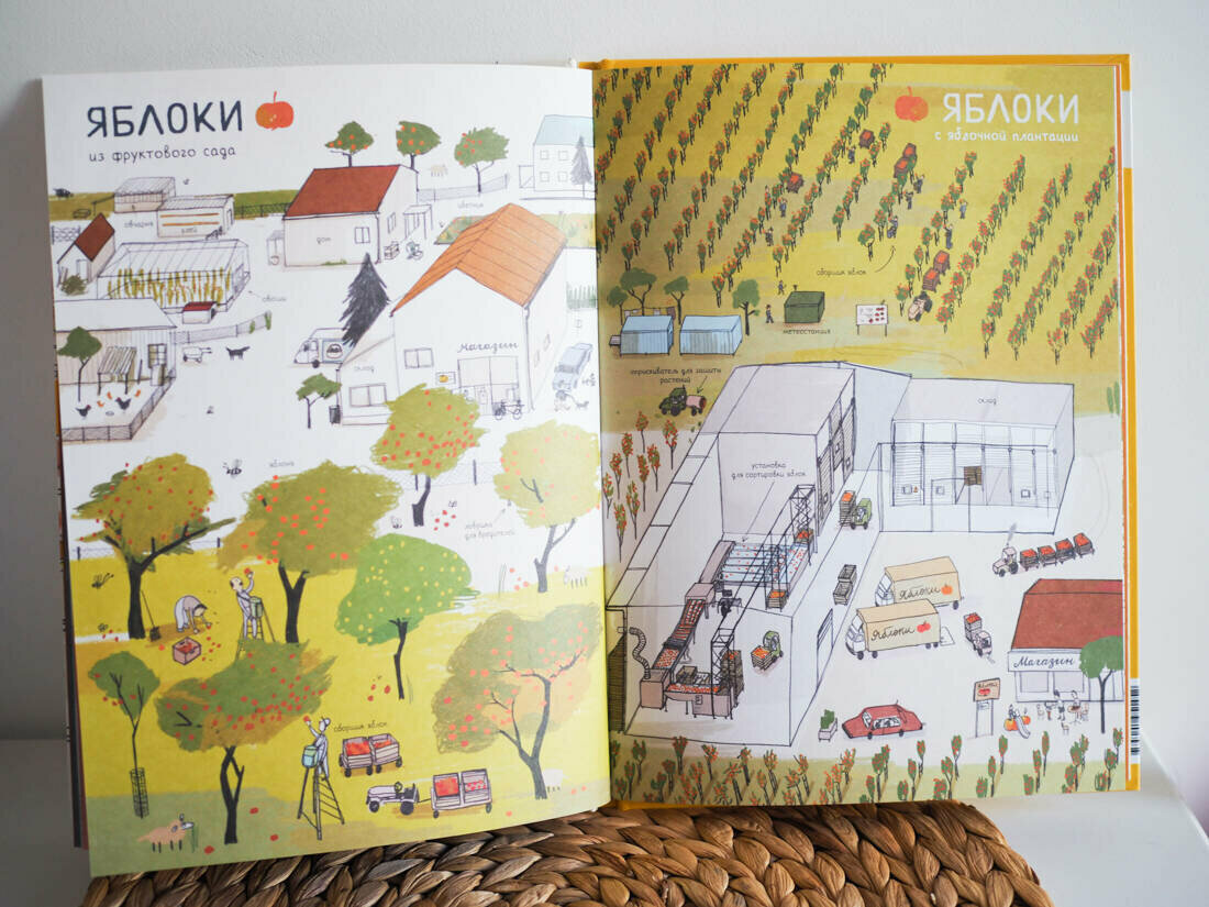Часто маленькие (и большие) почемучки задают вопросы, откуда берётся тот или иной продукт. В общих чертах каждый взрослый может ответить на эти вопросы, но куда интереснее иметь под рукой книгу, где отражён весь цикл производства до попадания на прилавок. В книге о еде 7 видов продуктов, которые регулярно присутствуют на нашем столе и чаще всего попадают сюда из магазина. Сначала идет разворот с общим видом, затем разворот с пояснениями каждого этапа. 6+ указано в рекомендациях, я бы советовала начинать лет с 4.