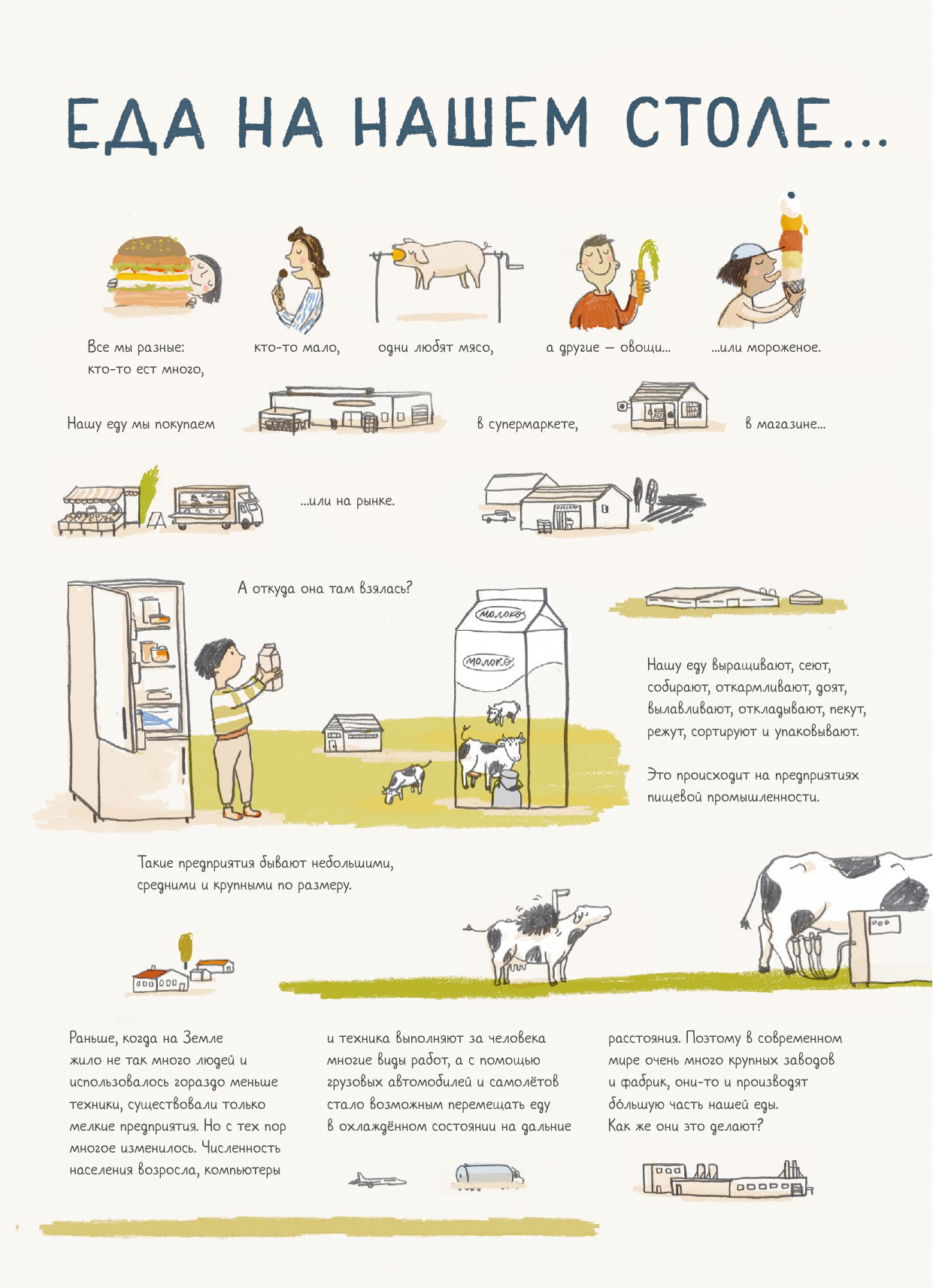 Книга Юлии Дюрр расскажет про долгий путь, который проходят продукты, прежде чем очутиться у нас на столе: о том, как нашу еду сеют, выращивают, собирают, пекут, сортируют, упаковывают и перевозят. Яркие и наглядные иллюстрации помогут понять, как работают крупные и малые предприятия пищевой промышленности, чем отличается фермерское молоко от фабричного и сколько требуется труда, чтобы мы смогли купить на прилавке помидор или яблоко. Прочитав книгу, вы по-новому посмотрите на содержимое вашей тарелки!
