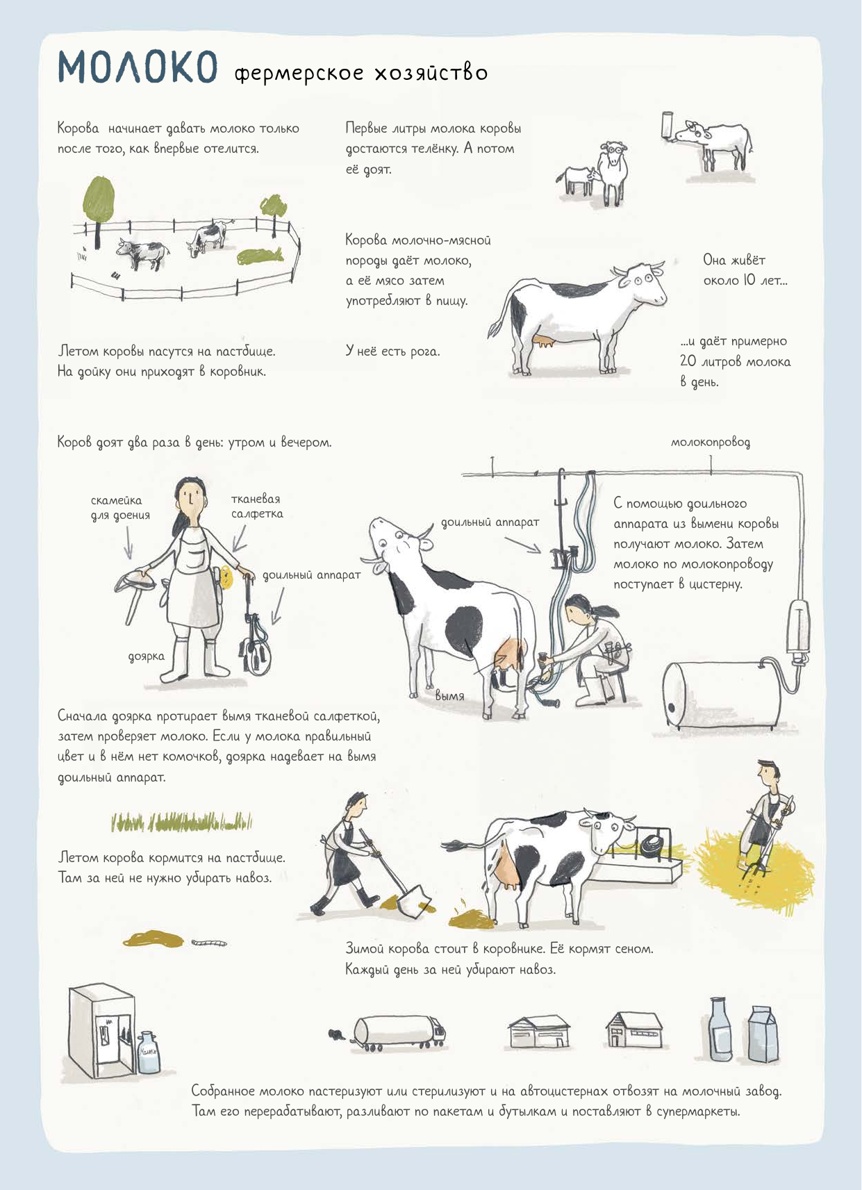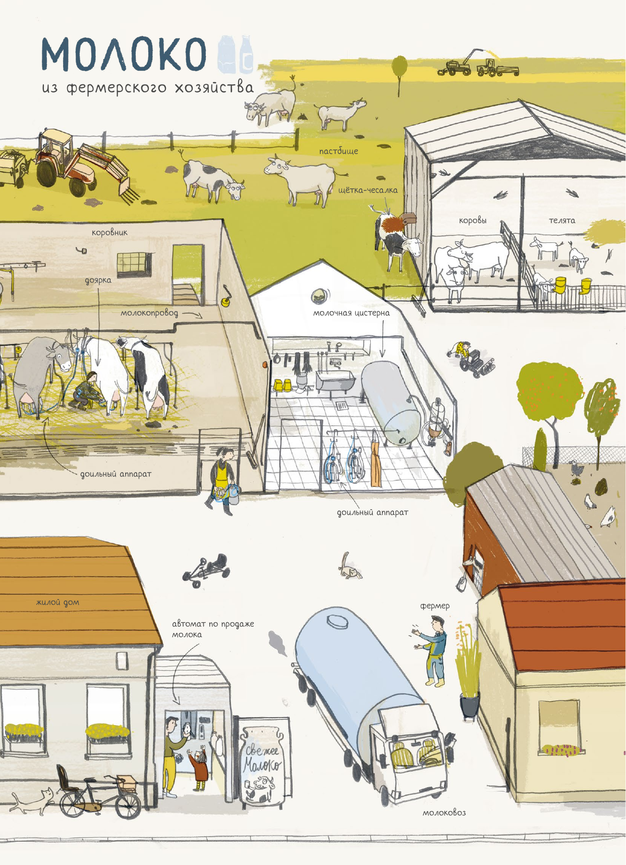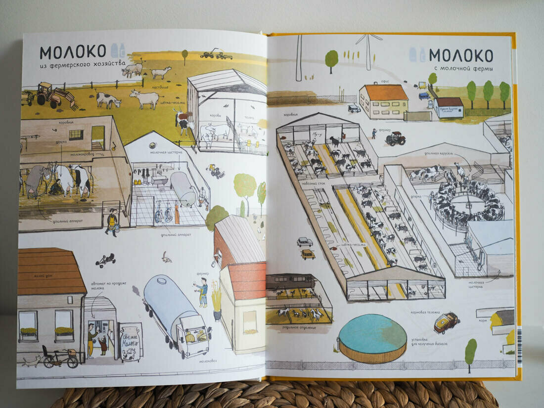 Книга небольшая, всего 16 разворотов, но поместилось на них столько всего интересного, многие рисунки для наглядности выполнены в разрезе. Рассматривается организация работы и выпуск продукции в сравнении на фермерских хозяйствах и крупных предприятий пищевой промышленности. Можно обсудить с ребенком разницу при производстве продуктов в небольших и промышленных объемах.