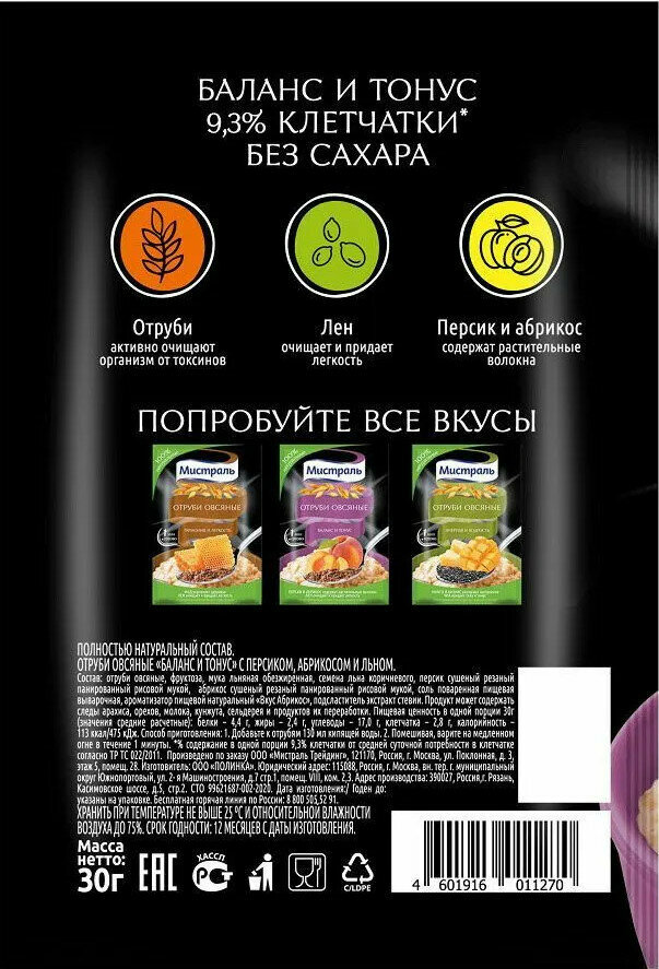 Отруби Мистраль овсяные Баланс и тонус Персик-Абрикос-Лен 30г Полинка