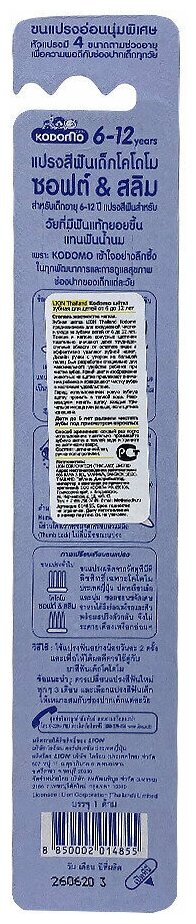 Зубная щетка Lion Thailand Kodomo предназначена для ежедневной чистки и ухода за зубами детей от 6 до 12 лет. Тонкие и мягкие конусные щетинки тщательно очищают даже труднодоступные области от остатков пищи и эффективно удаляют зубной налет.