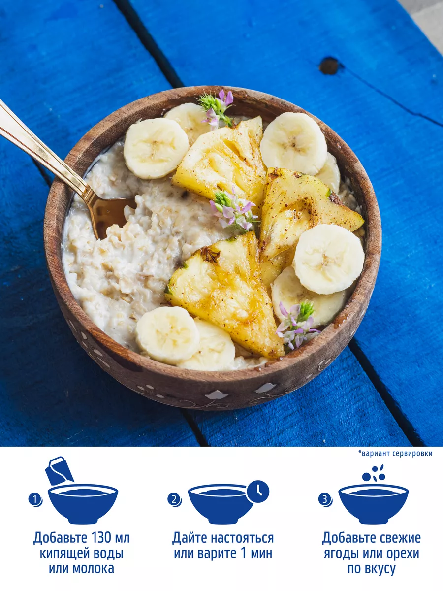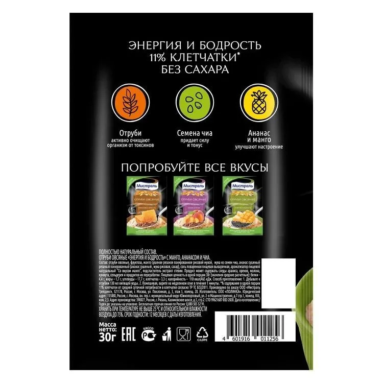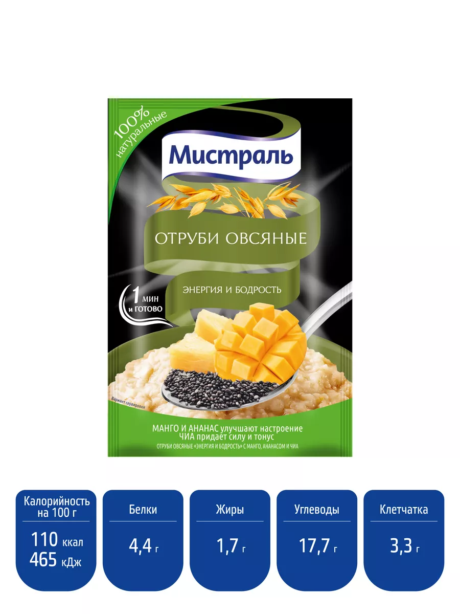 Отруби Энергия и бодрость содержат клетчатку, которая положительно влияет на процесс метаболизма, очищает организм от токсинов, кусочки фруктов манго и ананаса улучшают настроение, а семена чиа придают силу и тонус всему организму.
