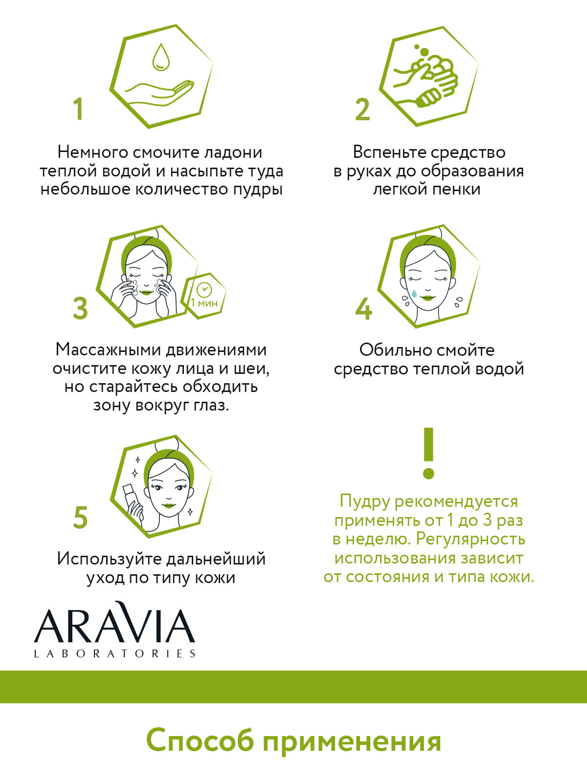| Способ применения | небольшое количество пудры насыпать в смоченную водой ладонь. Вспенить средство и массажными движениями нанести на влажную кожу лица и шеи, избегая области вокруг глаз. Смыть водой |