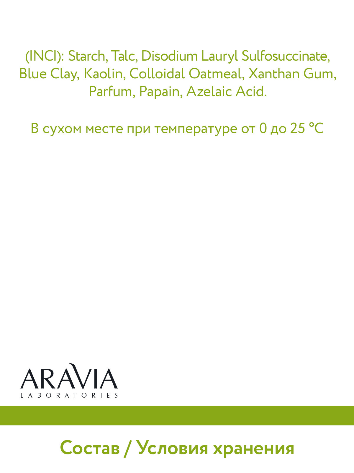 | Состав | starch, таlc, disodium lauryl sulfosuccinate, blue clay, kaolin, colloidal oatmeal, xanthan gum, parfum, papain, azelaic acid |