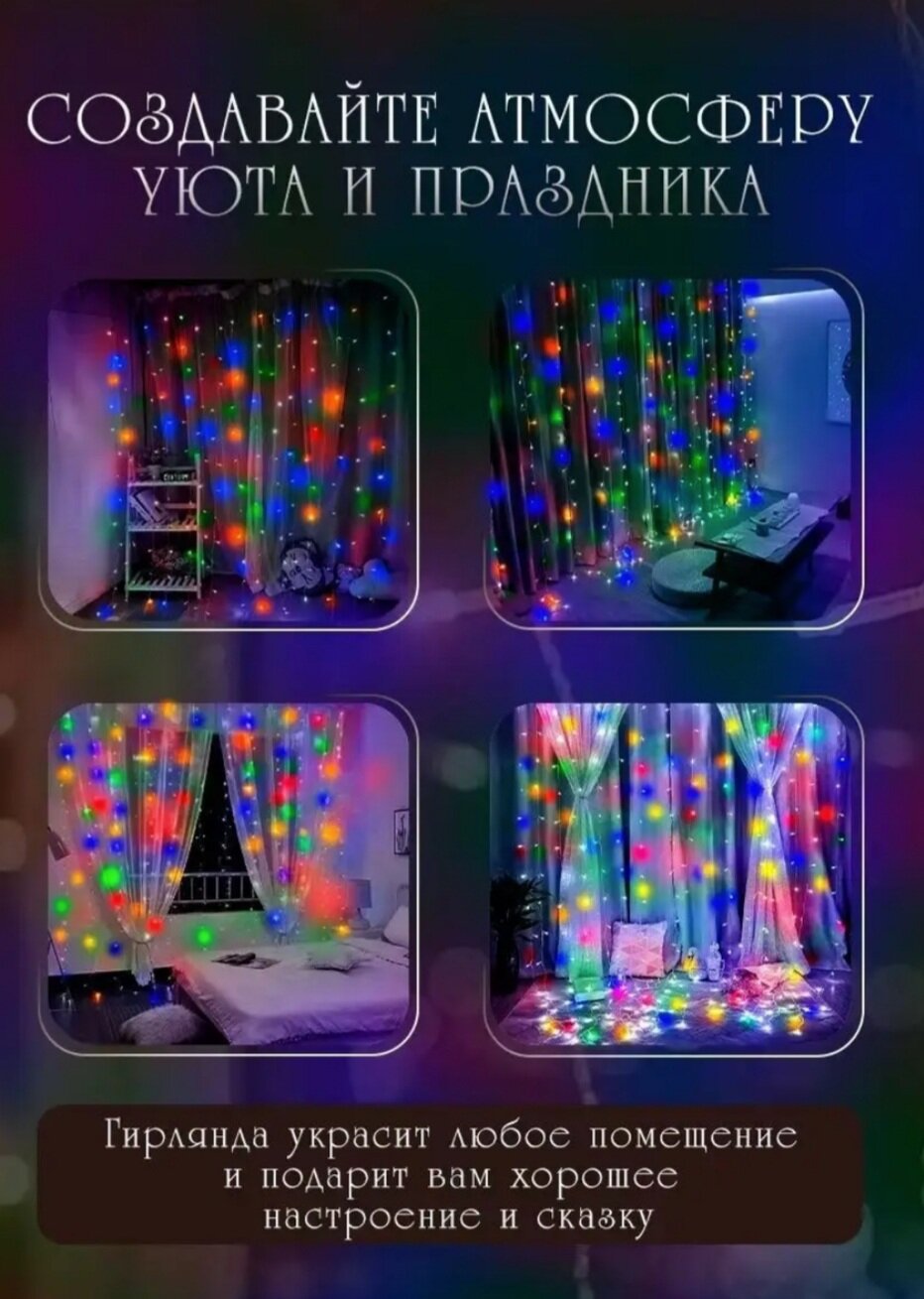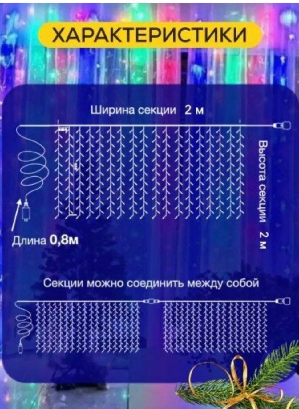 Конструкцией гирлянды предусмотрено наличие контроллера дляпринудительного переключениями между режимами свечения. Количество режимовсвечения - 8 шт. Цвет свечения гирлянды - холодный белый. Гирлянда работаетот сети. Номинальное напряжение электрической цепи гирлянды составляет 220В.