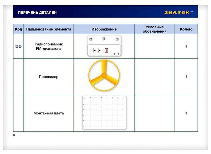 Помимо этого в «Руководстве пользователя» вы найдёте перечень элементов конструктора, а также их описание. Всего в набор входит 17 деталей, что позволяет, при определённом опыте, собрать больше проектов, чем описано в руководстве пользователя. Для удобства собирания деталей в коробку на последней обложке приведена схема расположения элементов.